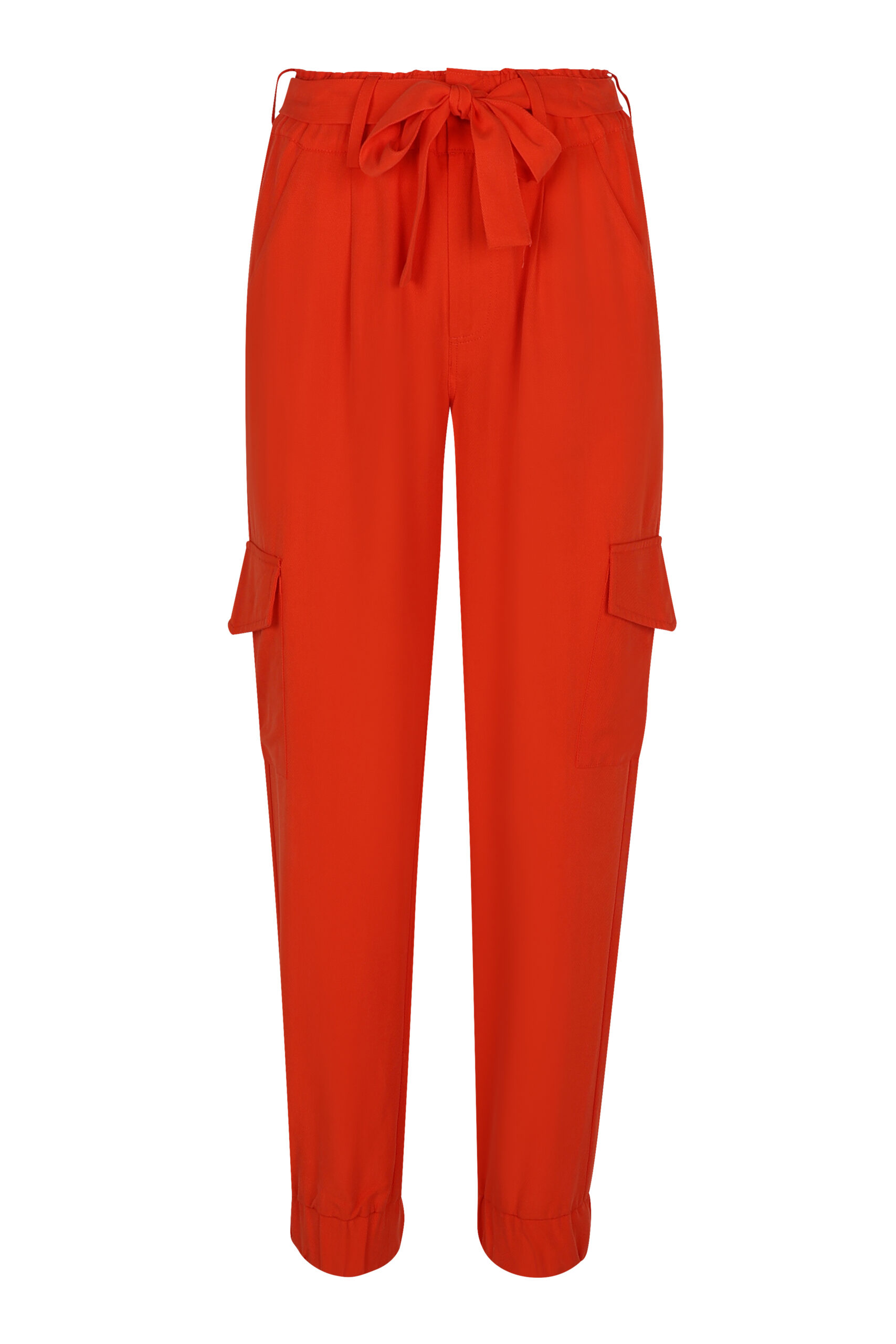 Broek van Elvira met een elastische tailleband voorzien van riemlussen en strikceintuur, steekzakken, klepzakken op het bovenbeen en paspelzakken aan de achterzijde. Materiaal: Tencel 100%