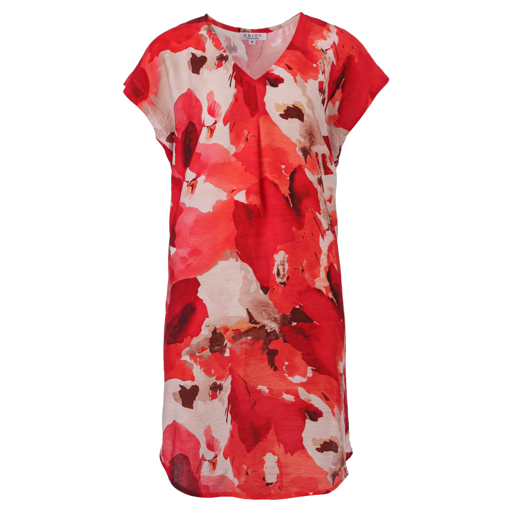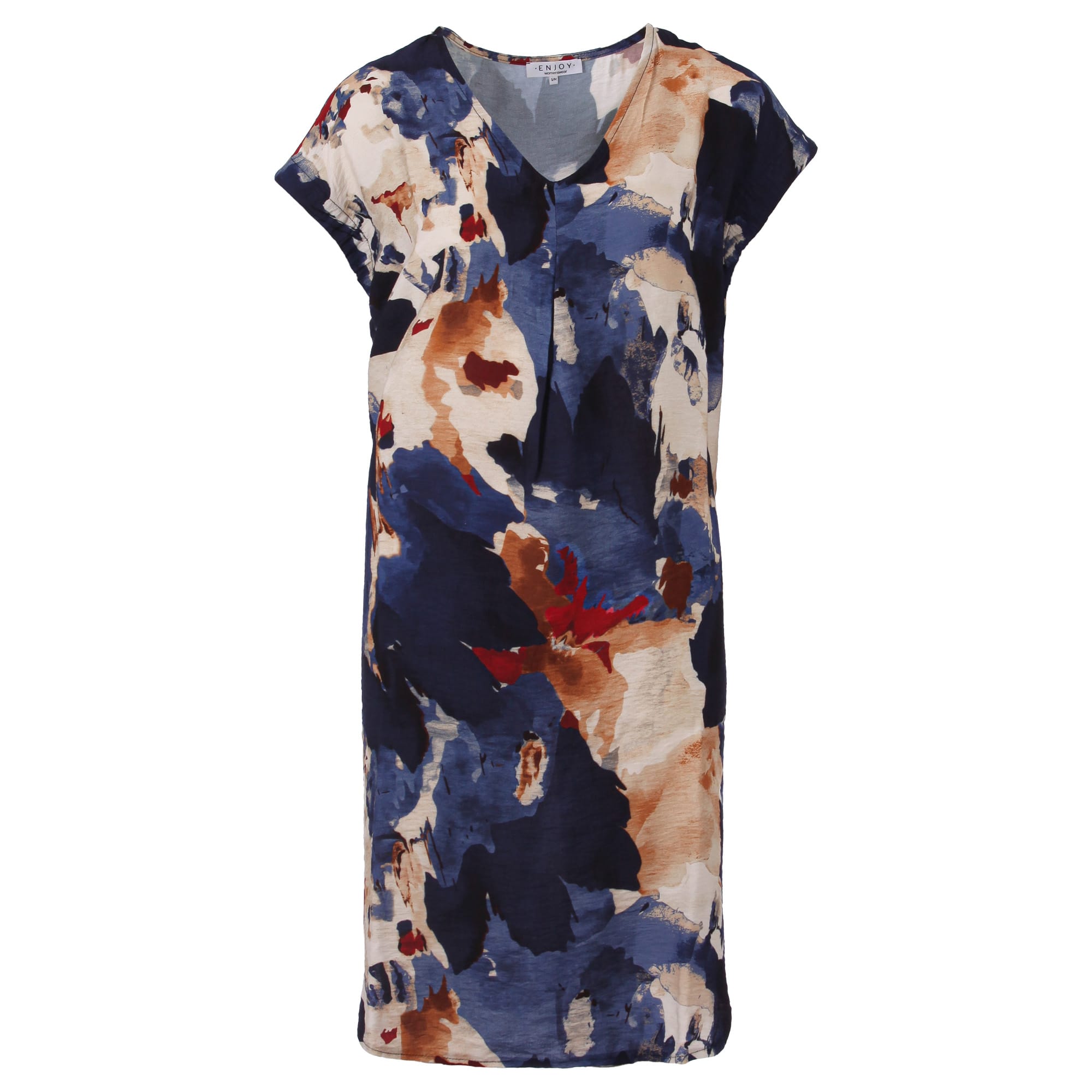Jurk van Enjoy in een all-over dessin met korte aangeknipte mouwen, V-hals en steekzakken. Materiaal: Viscose 86%| polyamide 14%