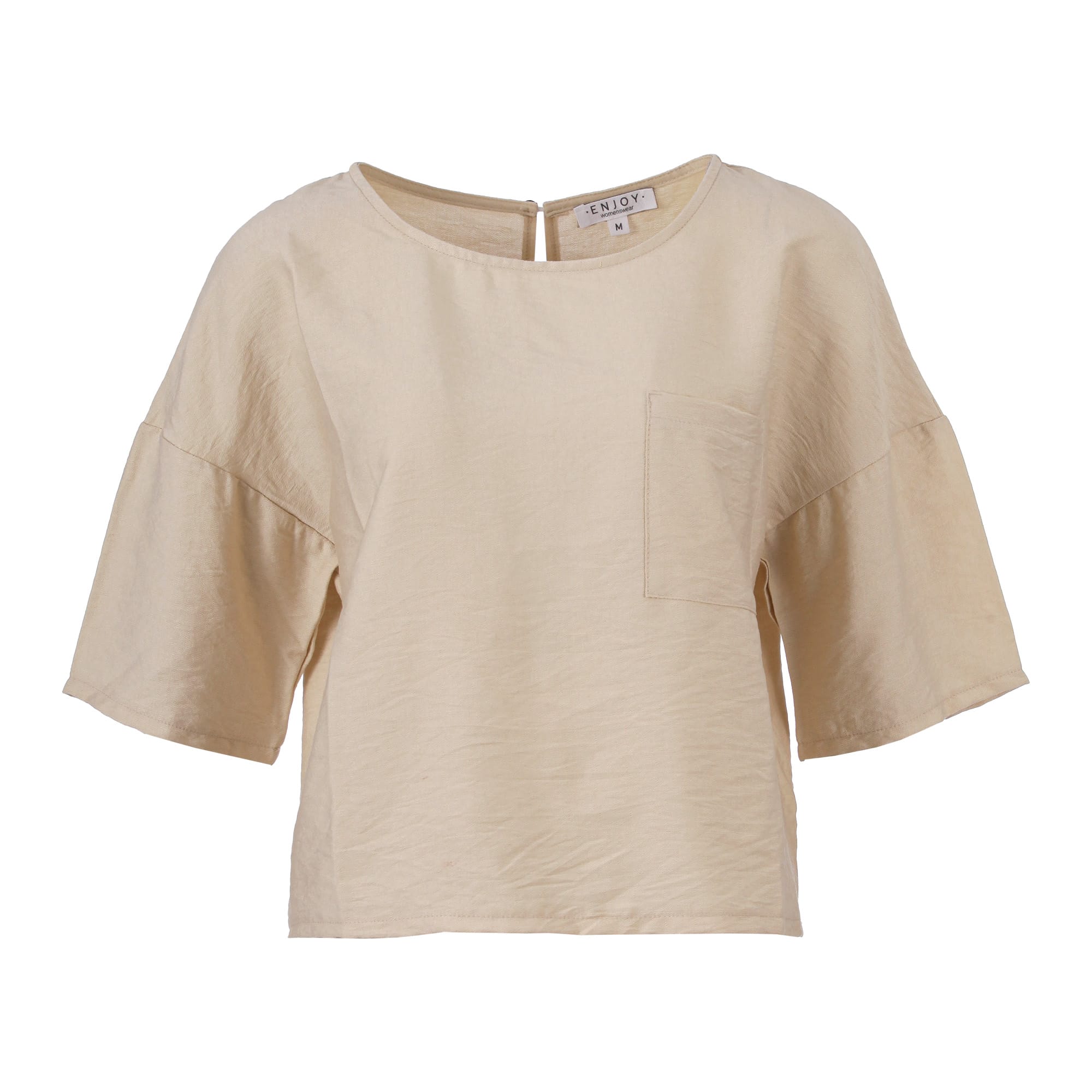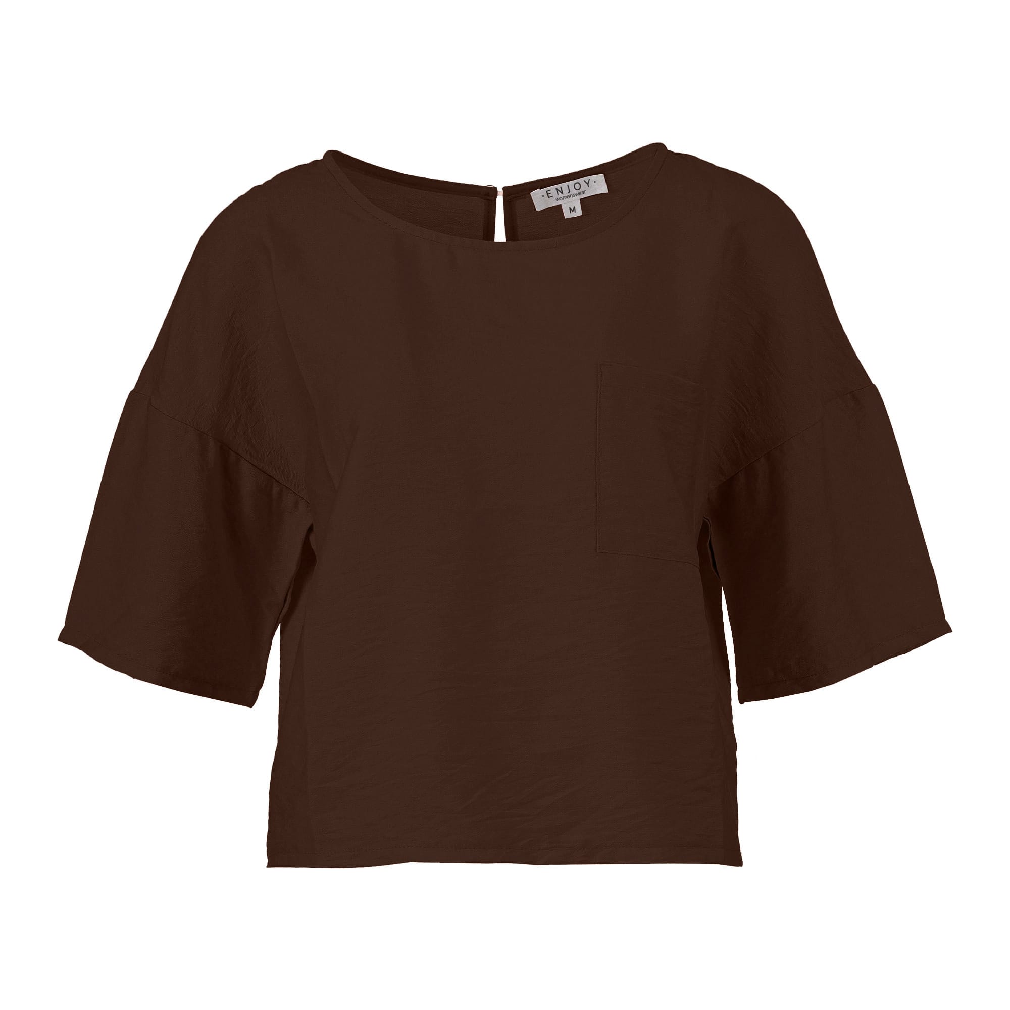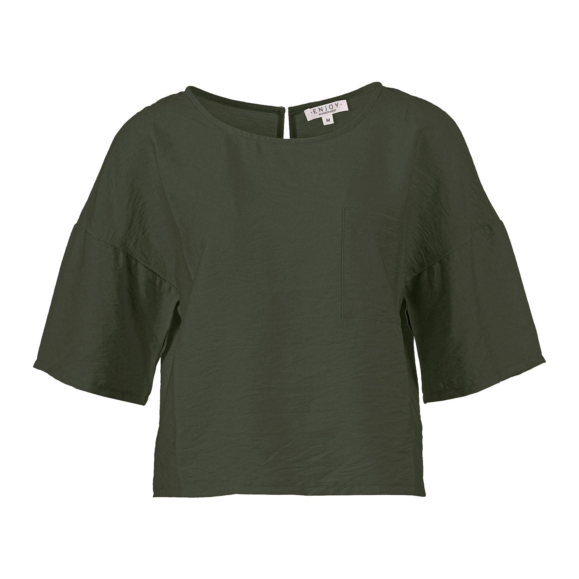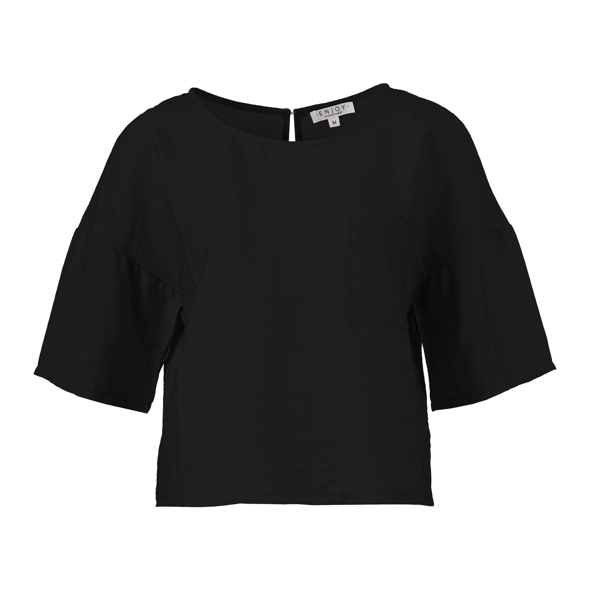 Blouse van Enjoy met korte mouwen, verlaagde schouderbanden, ronde hals, opgestikte borstzak en een keyhole voorzien van knoopsluiting aan de achterzijde. Materiaal: Viscose 85%| polyamide 15%