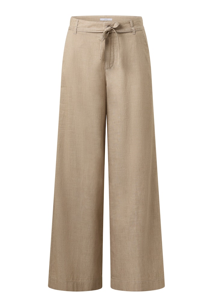 Broek van Angels met wijde pijpen, knoop- en ritssluiting, steekzakken, twee paspelzakken aan de achterzijde en een strikkoord onder de tailleband.