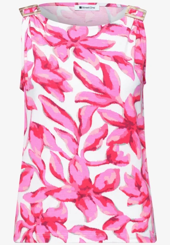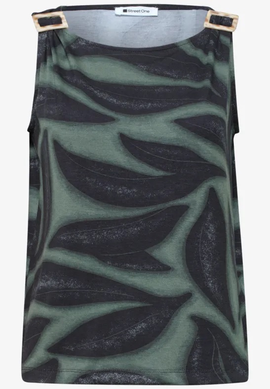 Mouwloos jersey shirt van Street One in een all-over dessin met een boothals en gespdetails aan de schouderbandjes. Materiaal: Viscose 95%| elastan 5%