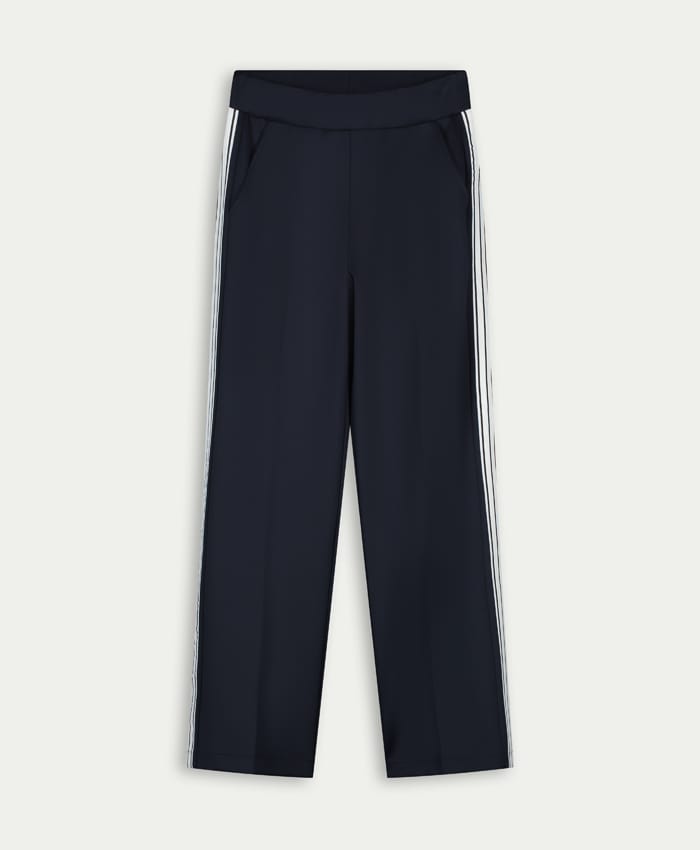 Broek van Elvira met een elastische tailleband, rechte pijpen voorzien van gestreepte bies, steekzakken en een paspelzak aan de achterzijde.