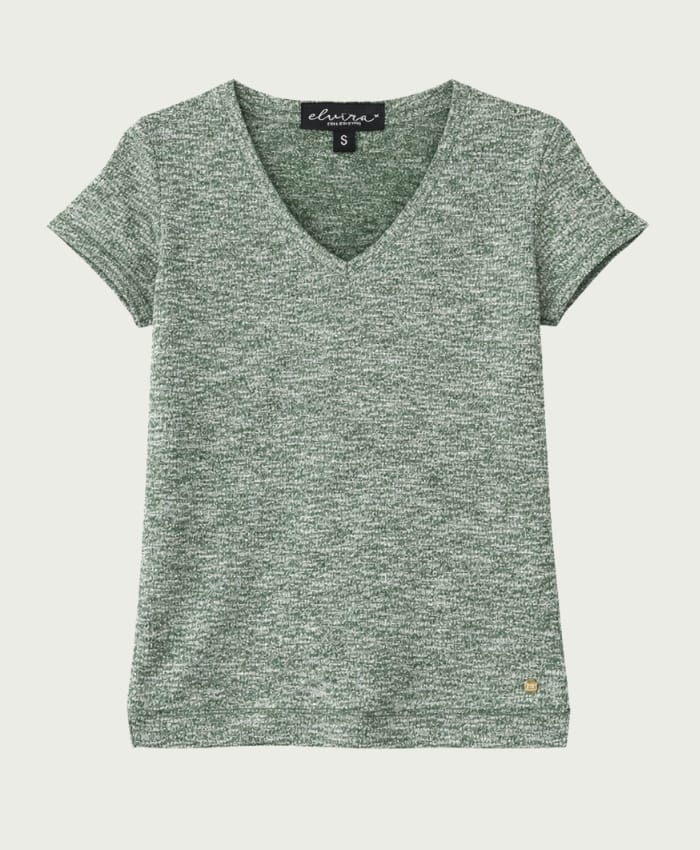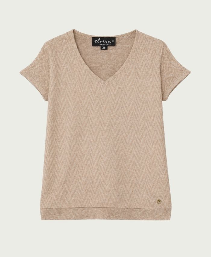 Shirt van Elvira in zig-zag dessin met een subtiele glitter erin verwerkt, korte mouwen en V-hals.