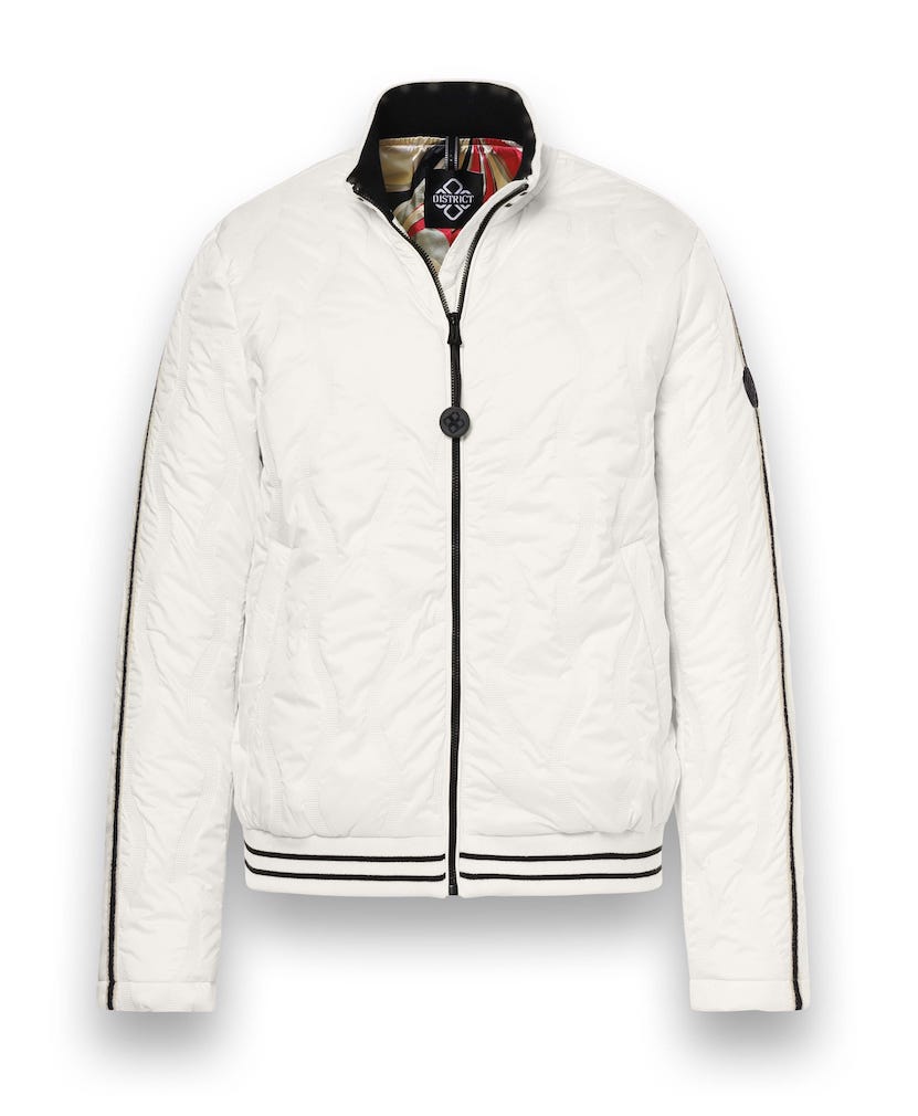 Gewatteerd bomberjack van District met een ritssluiting, opstaande kraag, steekzakken, contrasterende bies langs de mouwen en gestreepte ribgebreide boorden. Materiaal: Polyester 100%