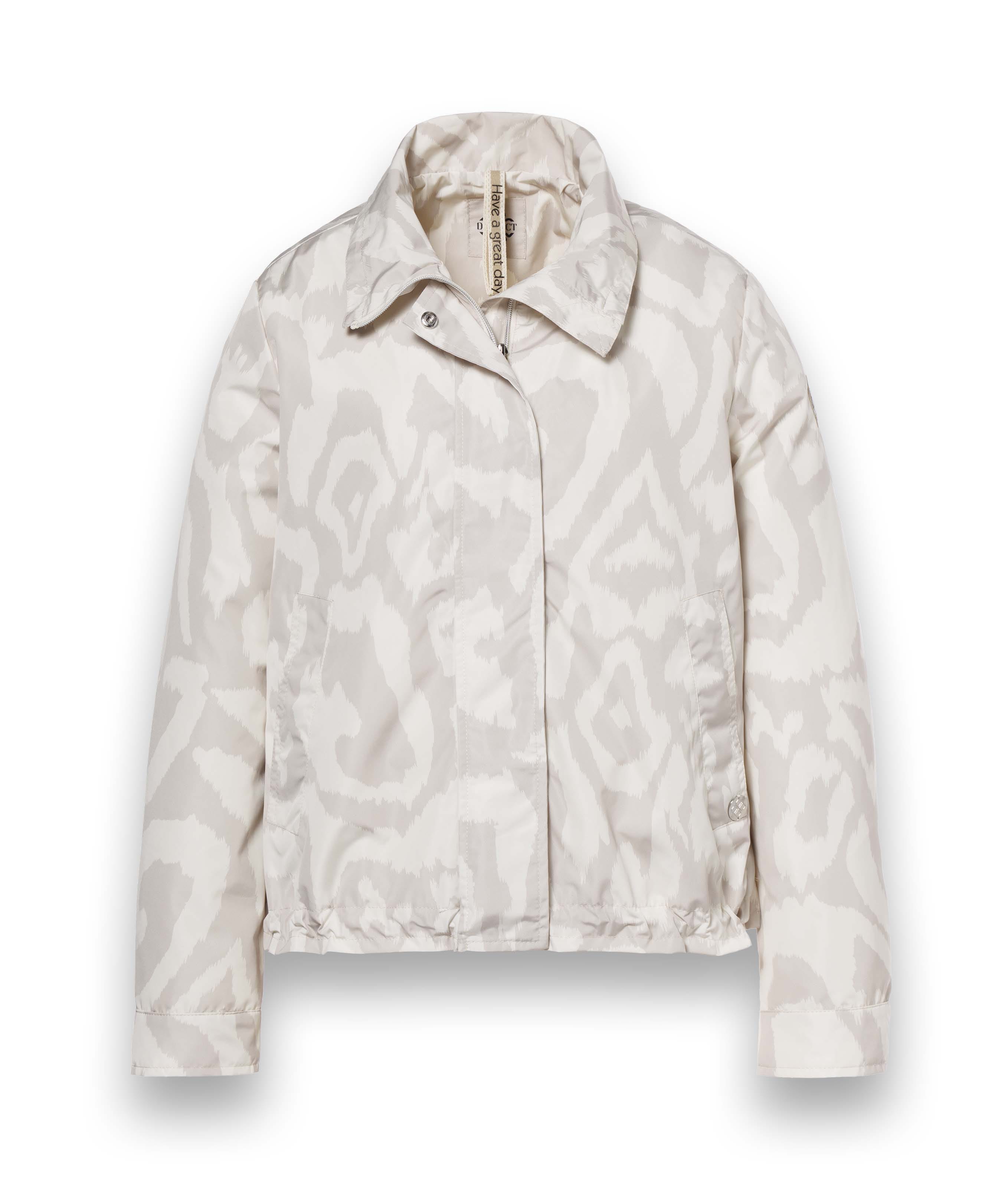 Waterafstotend jack van District in een all-over dessin met een verborgen drukknoop- en ritssluiting, opstaande kraag, twee steekzakken en plooien in de zoom. Materiaal: Polyester 100%