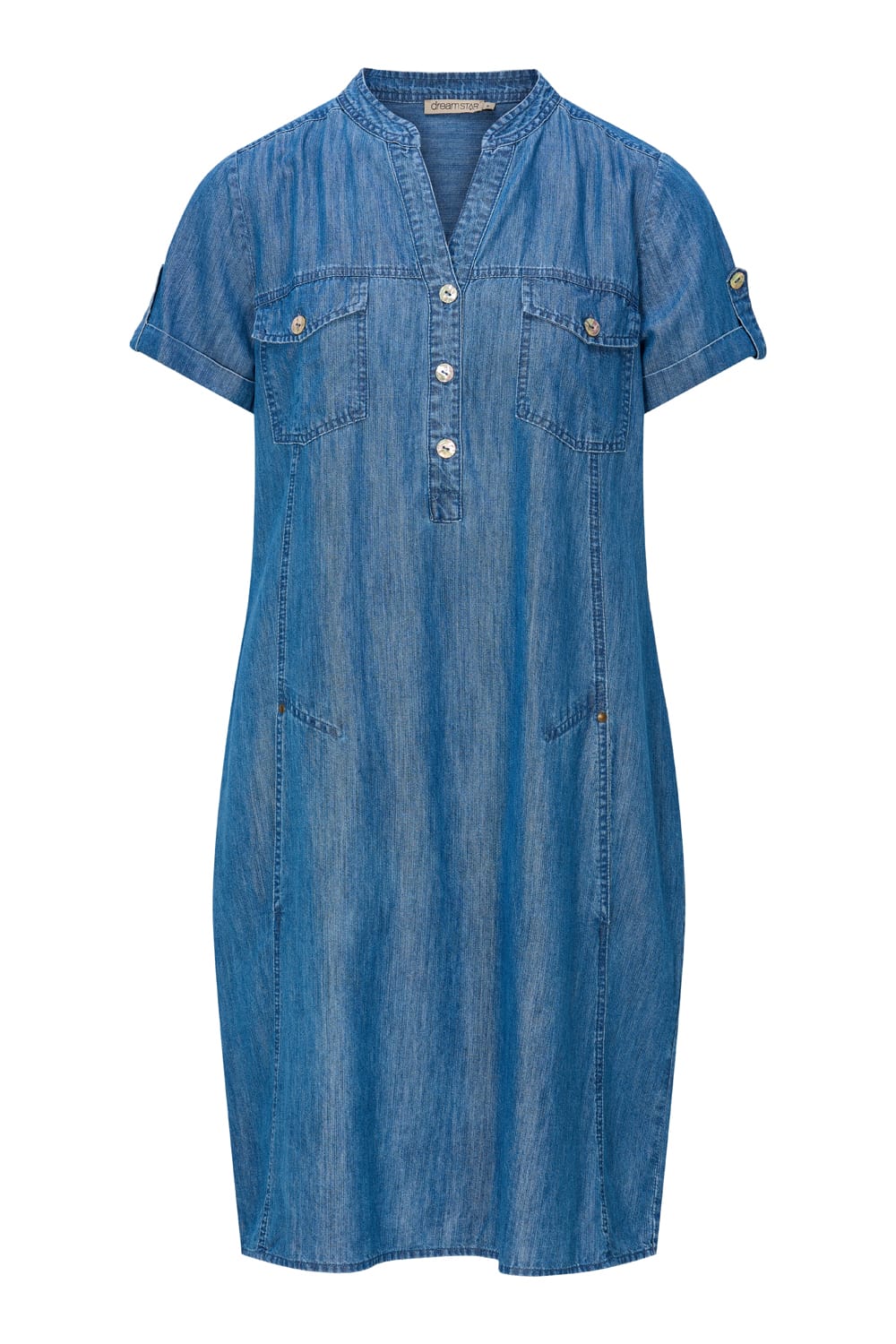 Jurk van Dreamstar in een denim-look met korte mouwen voorzien van knoopdetail, opstaande kraag, V-hals voorzien van korte knoopsluiting, steekzakken en twee klepzakken op de borst.