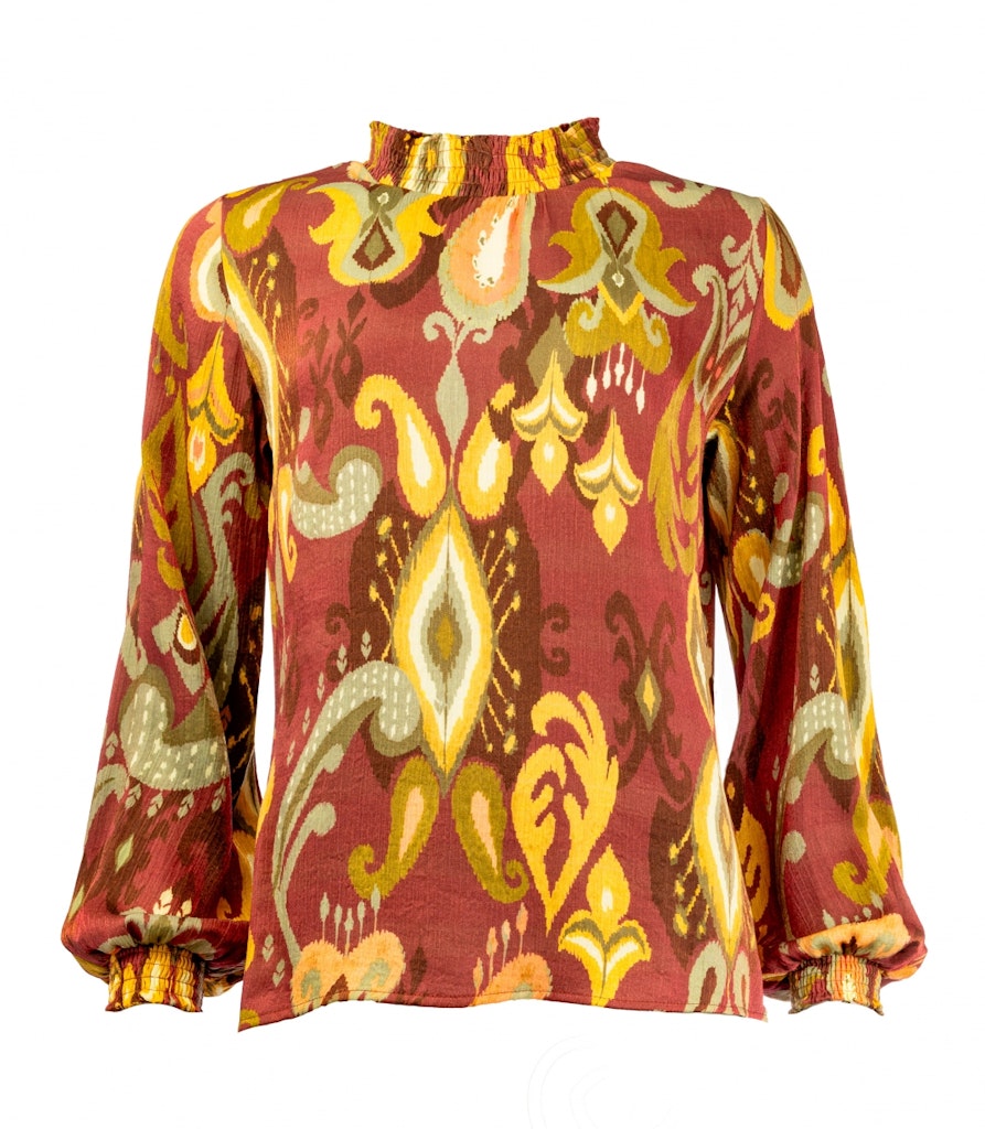 Shirt van NED in een all-over dessin met lange mouwen voorzien van gesmokte manchetten en een gesmokte opstaande kraag.