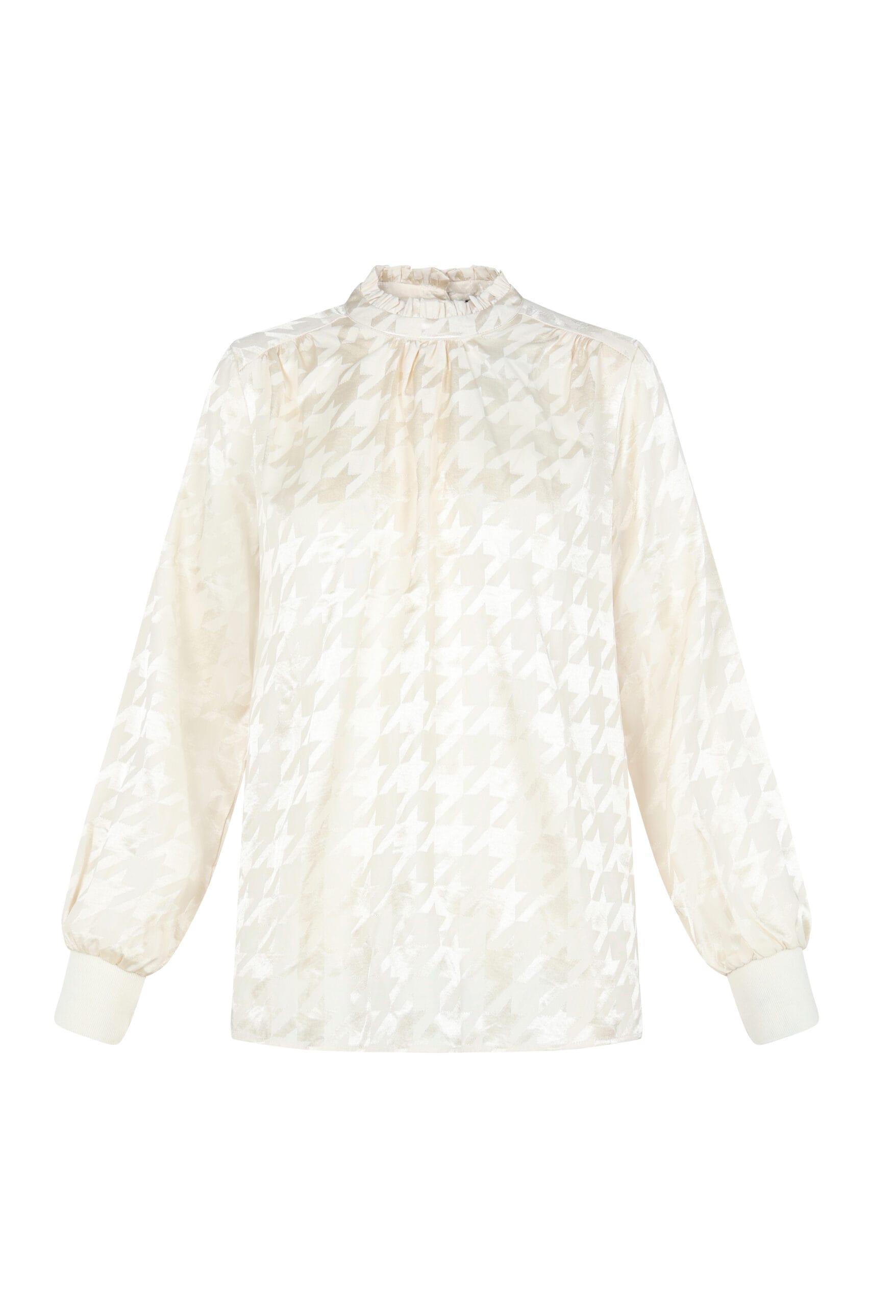 Blouse van Elvira in een pied-de-poule dessin met lange mouwen, plooi details aan de schouders en een opstaande kraag voorzien van sluiting aan de achterzijde.