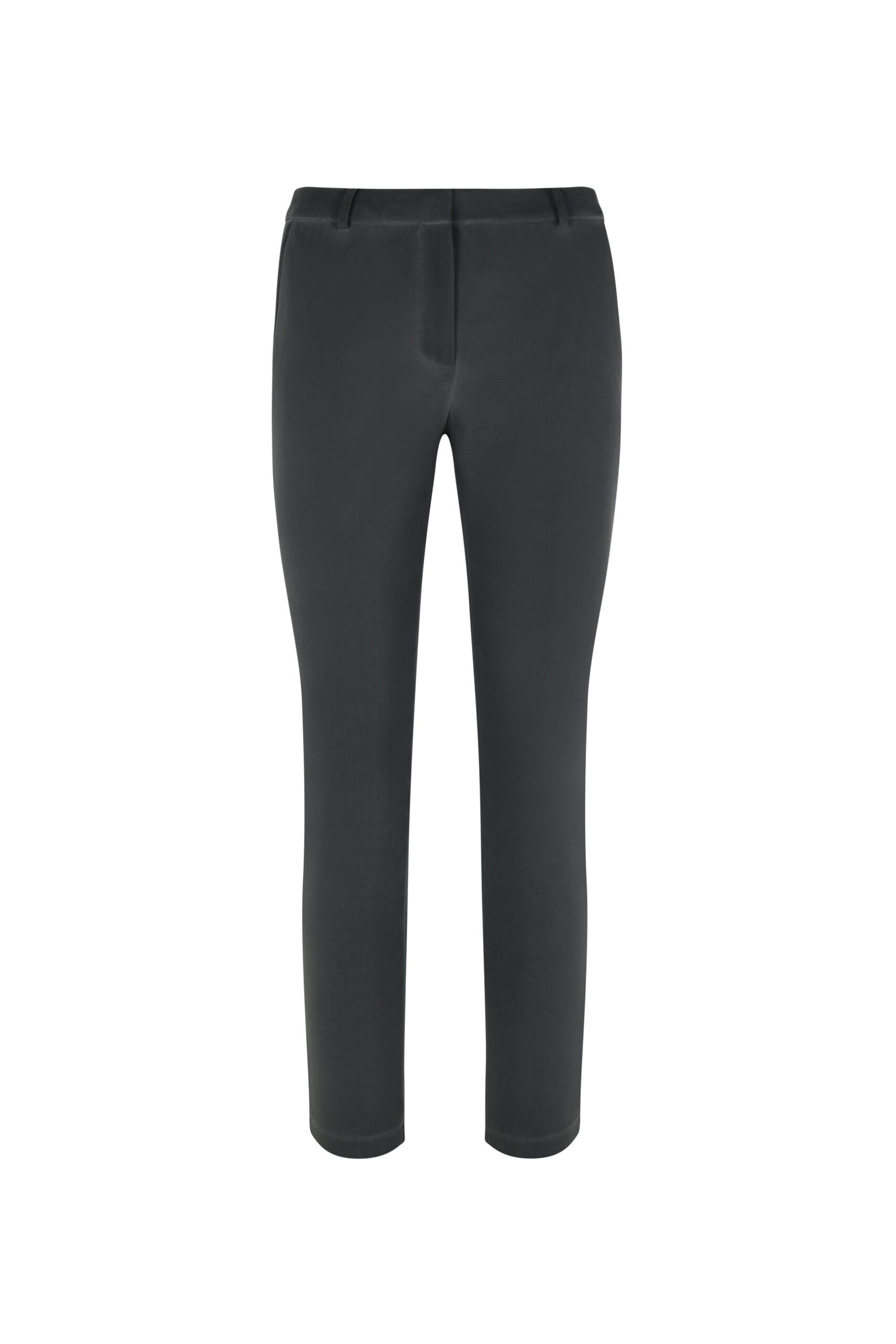 Broek van Elvira met smalle pijpen, schuif-en ritssluiting, steekzakken en paspelzakken aan de achterzijde.