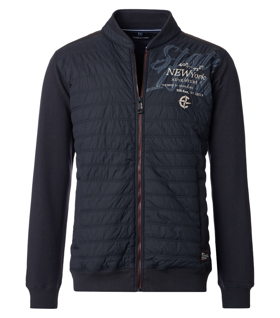 Vest van Casa Moda met een gewatteerde voorzijde, lange mouwen, opstaande kraag, ritssluiting, print op de linkerborst, twee steekzakken en ribgebreide boorden.
