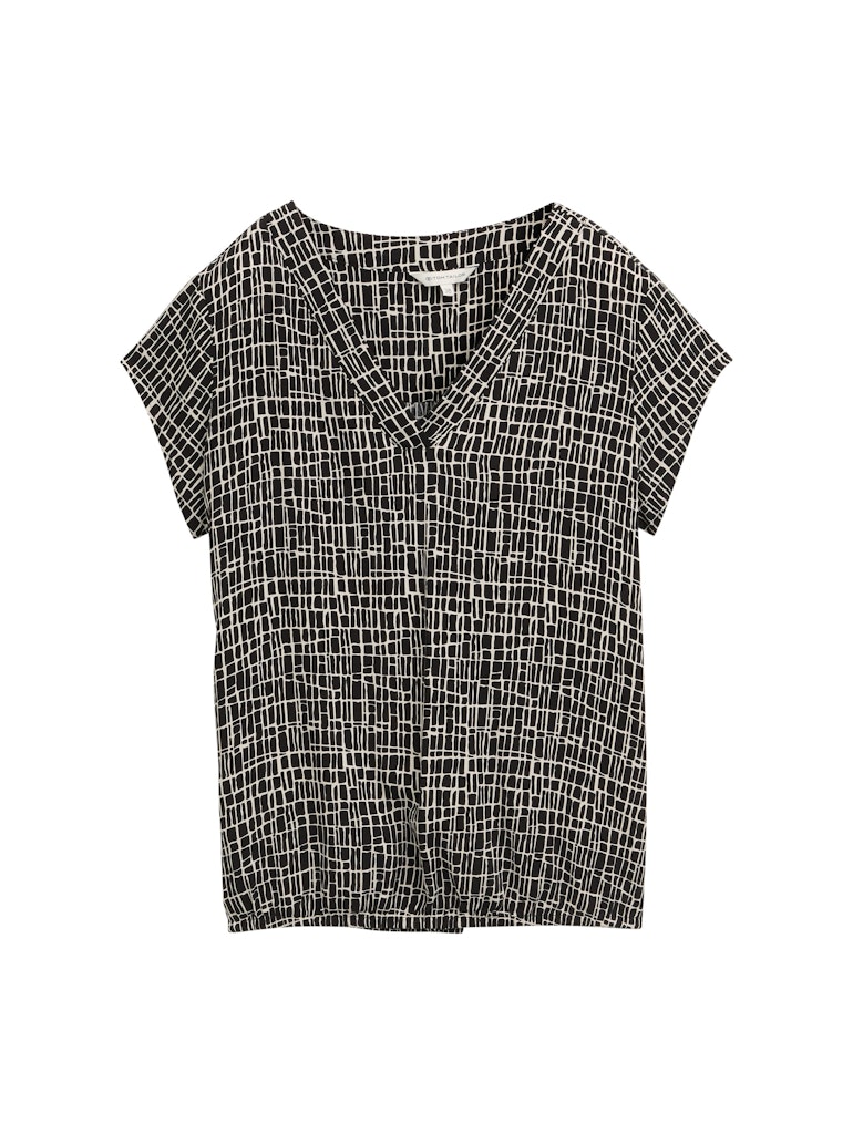Blouse van Tom Tailor in een all-over dessin met korte mouwen, V-hals en een elastische zoom. Materiaal: Viscose 100%