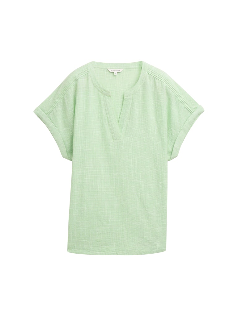Blouse van Tom Tailor in een structuur dessin met korte aangeknipte mouwen voorzien van omslag en een V-hals. Materiaal: Katoen 100%
