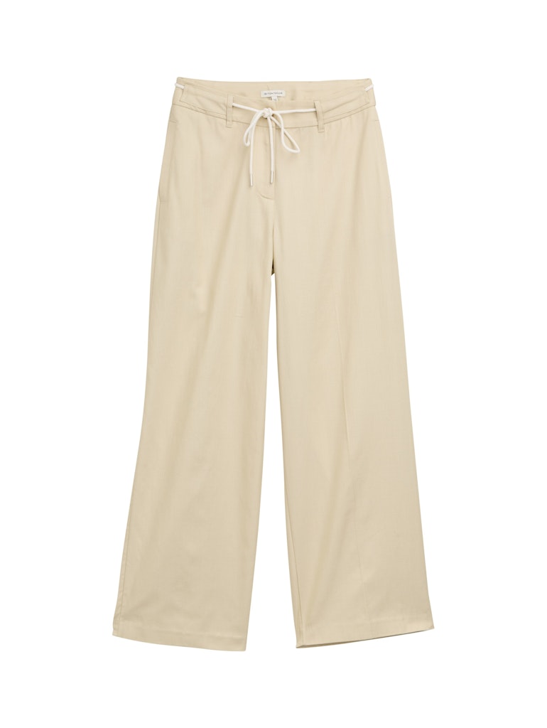 Broek van Tom Tailor met wijde pijpen, knoop- en ritssluiting, steekzakken, twee paspelzakken aan de achterzijde en een strikkoord in de taille.