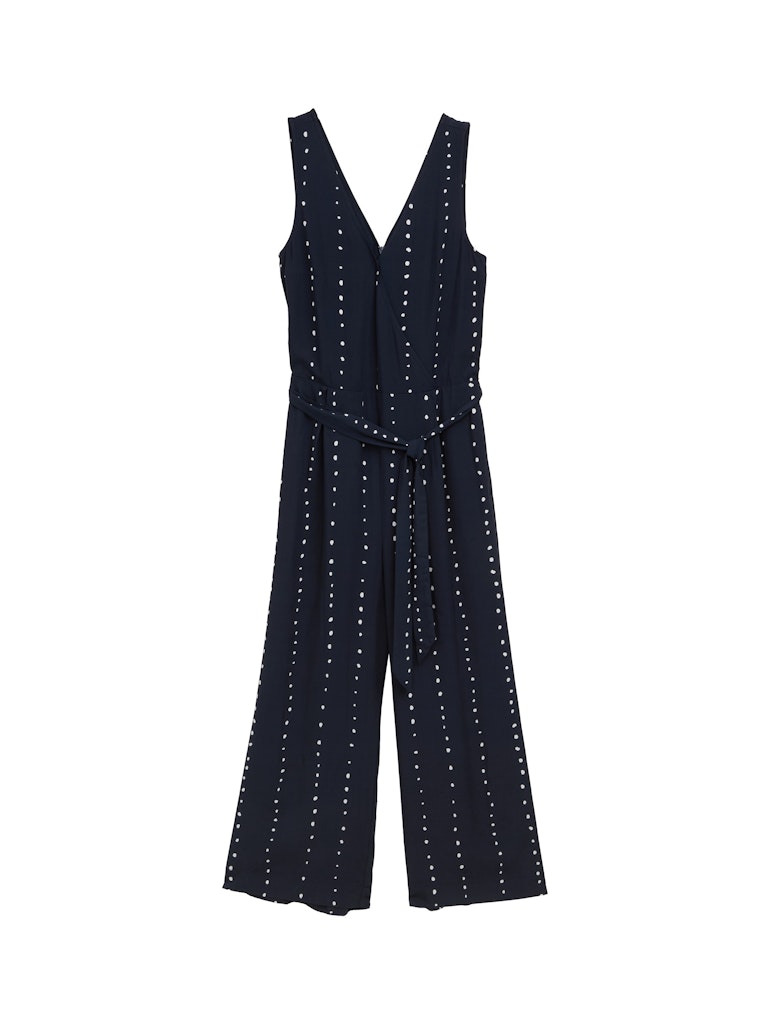 Mouwloze jumpsuit van Tom Tailor in een stippen print met enkellange wijde pijpen, V-hals aan de voor- en achterzijde, verborgen ritssluiting en een strikceintuur in de taille.