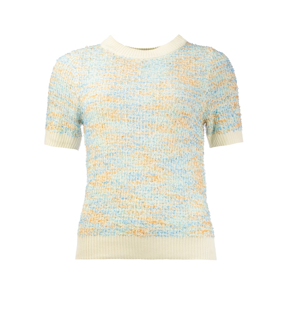 Trui van Inck in een gekleurd gemêleerd dessin met korte mouwen, ronde hals en ribgebreide boorden. Materiaal: Viscose 64%| polyamide 22%| polyester 14%