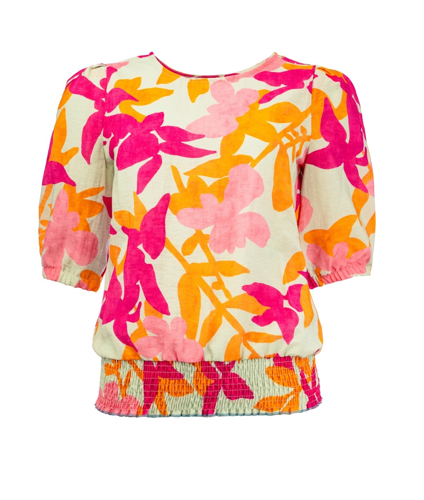 Shirt van N.E.D. in een bloemen dessin met korte pofmouwen, ronde hals en een gesmokte zoom aan de onderzijde. Materiaal: Viscose 62%| polyamide 25%| linnen 13%