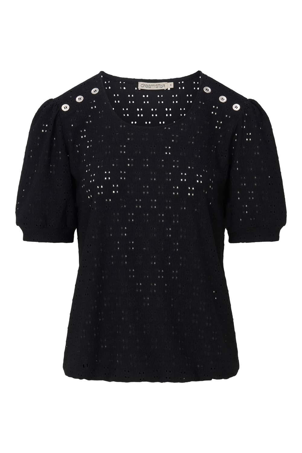 Ajour blouson van Dreamstar met korte pofmouwen, ronde hals, knoopdetail op de schouders en een elastische zoom.