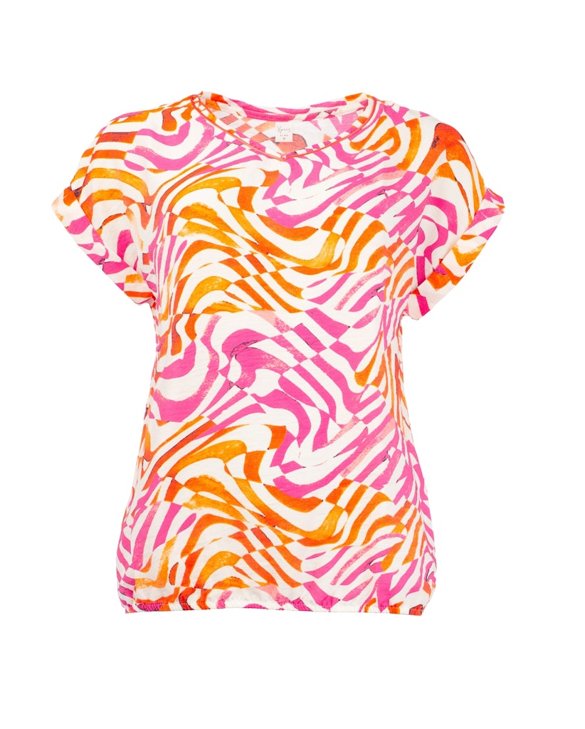 Shirt van N.E.D. in een all-over dessin met een ronde hals, korte aangeknipte mouwen voorzien van omslag en een elastische zoom. Materiaal: Viscose 75%| polyamide 25%