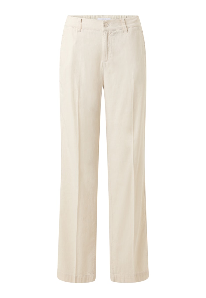 Broek van Angels met wijde pijpen, knoop- en ritssluiting steekzakken en twee paspelzakken en een elastische tailleband aan de achterzijde. Materiaal: Katoen 100%