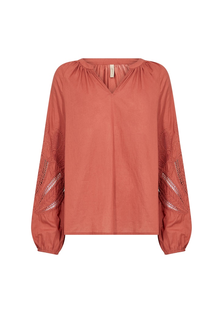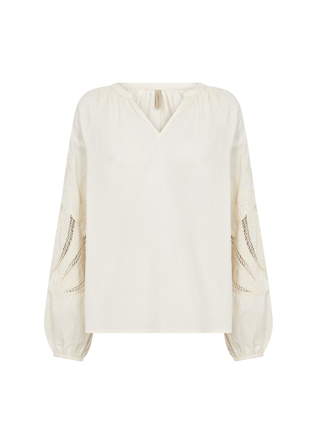 Blouse van Soya Concept met een V-hals en lange pofmouwen voorzien van opengewerkte, geborduurde details. Materiaal: Katoen 100%
