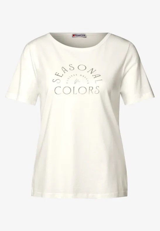 T-shirt van Street One met korte mouwen, ronde hals en een glanzende tekstprint op de borst. Materiaal: Katoen 50%| modal 50%