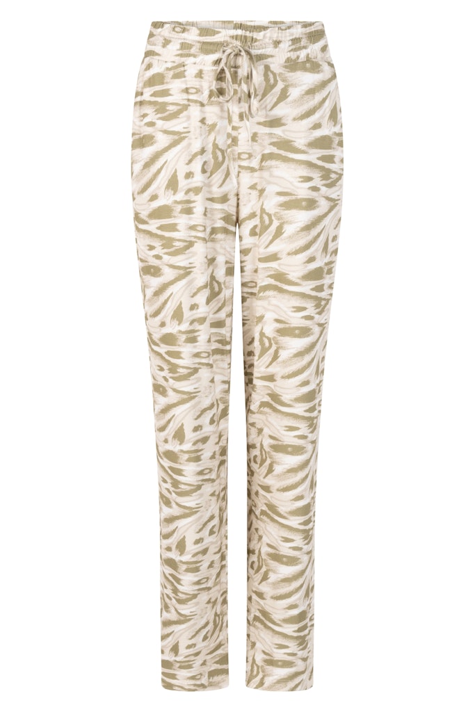 Broek van Zoso in een all-over dessin, steekzakken, paspelzakken aan de achterzijde en een elastische tailleband voorzien van trekkoord.