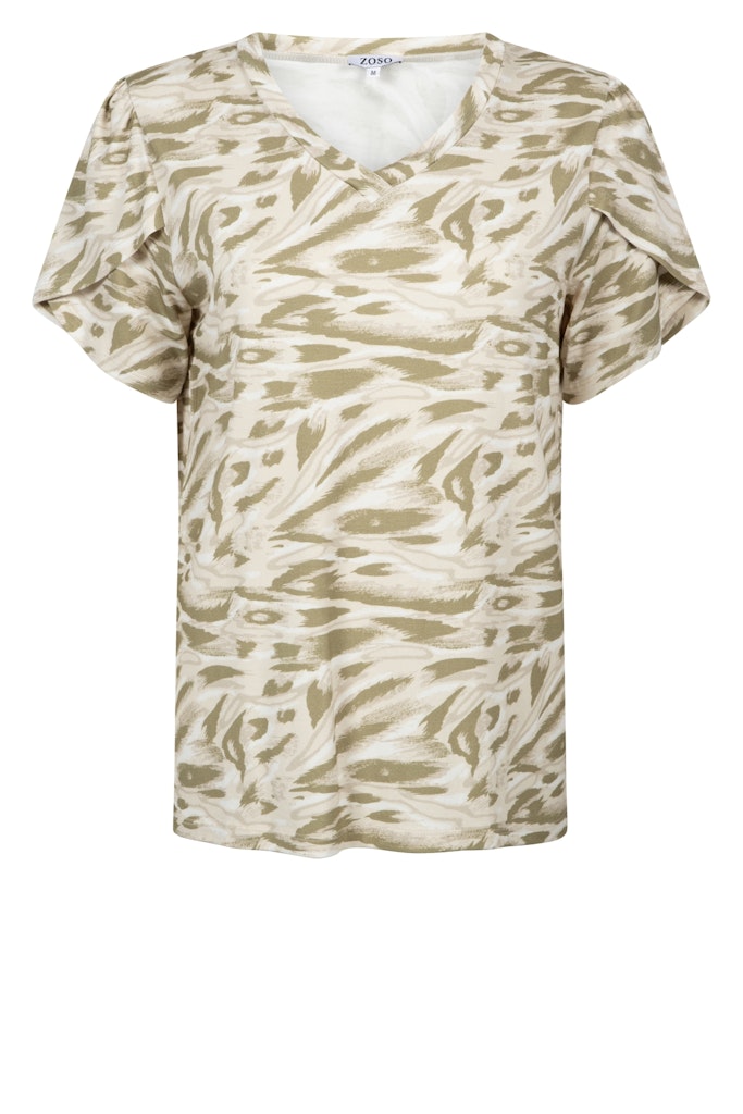 Blouse van Zoso in een all-over dessin met een V-hals en korte wijde mouwen voorzien van overslag. Materiaal: Viscose 95%| elastan 5%