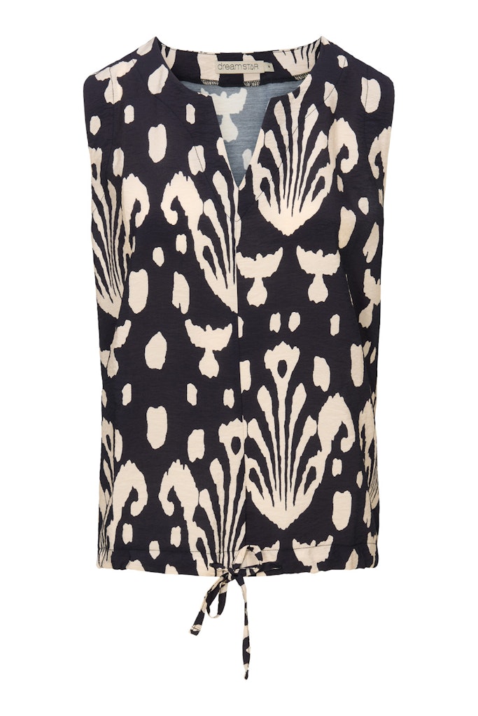 Mouwloze top van Dreamstar in een all-over dessin met een V-hals en een trekkoord in de zoom. Materiaal: Viscose 85%| polyamide 15%