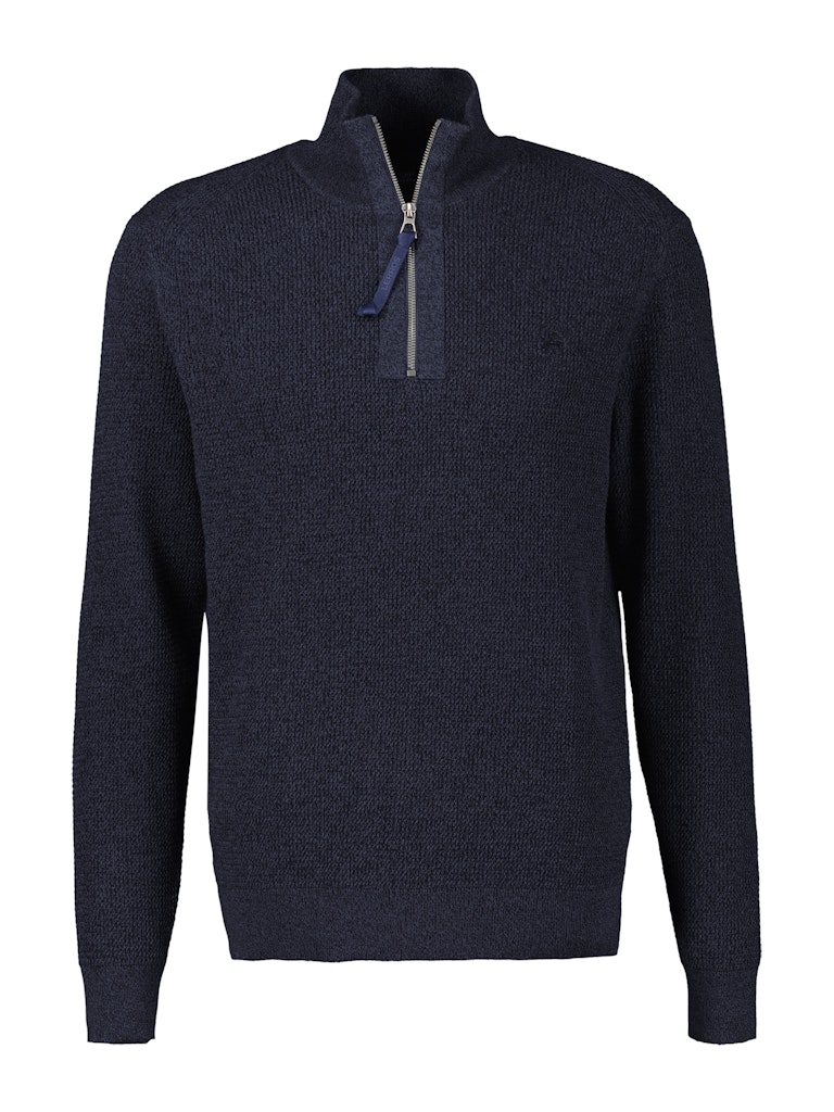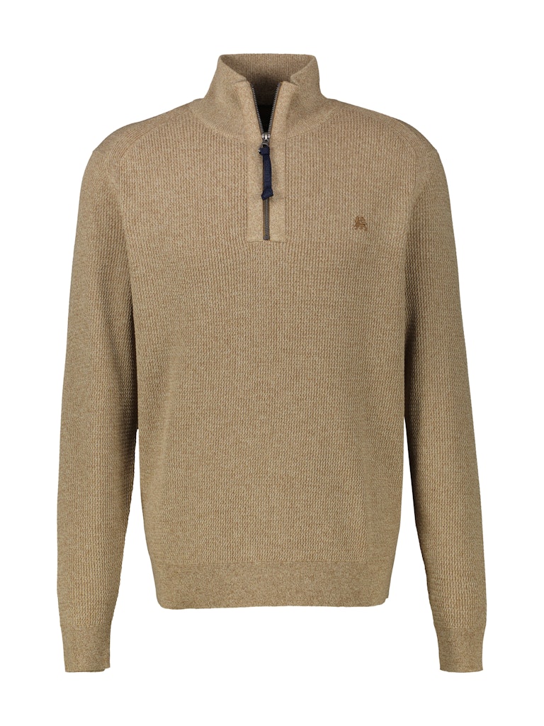 Trui van Lerros in een zachte structuurbreisel met lange mouwen, opstaande kraag voorzien van korte ritssluiting en geborduurd logo op de linkerborst.