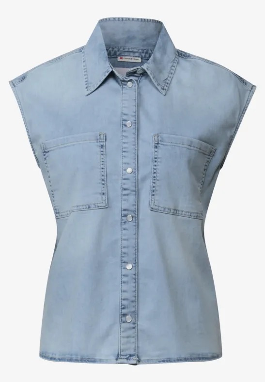 Mouwloze denim blouse van Street One met een kraag, drukknoopsluiting en opgestikte borstzakken. Materiaal: Katoen 75%| modal 12%| polyester 9%| elastan 4%