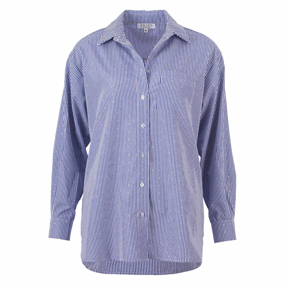 Gestreepte blouse van Enjoy voorzien van all-over strass-steentjes met lange mouwen, kraag, knoopsluiting en een opgestikte borstzak.