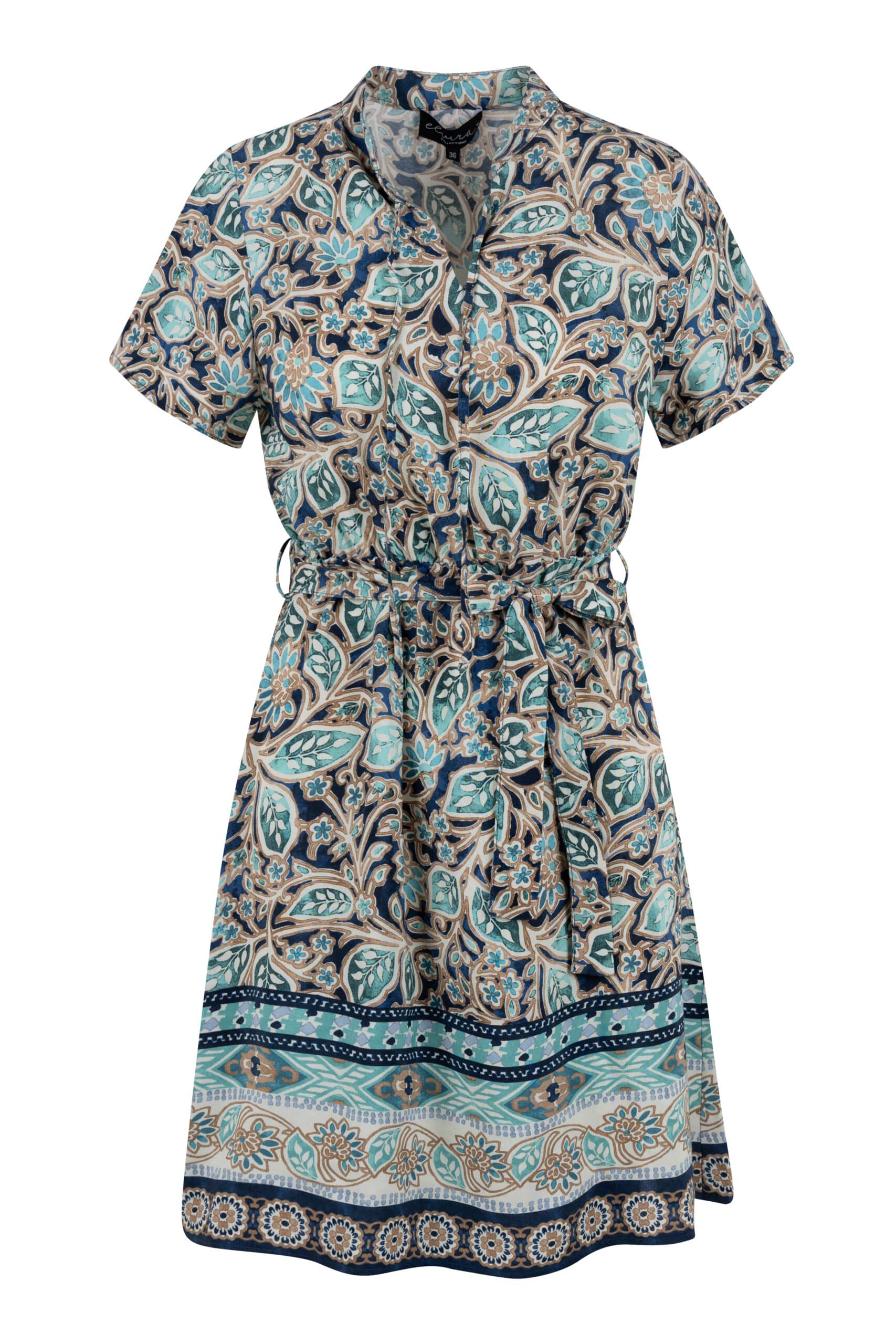 Jurk van Elvira in een all-over dessin met korte mouwen, kraag, korte knoopsluiting en een strikceintuur in de taille.