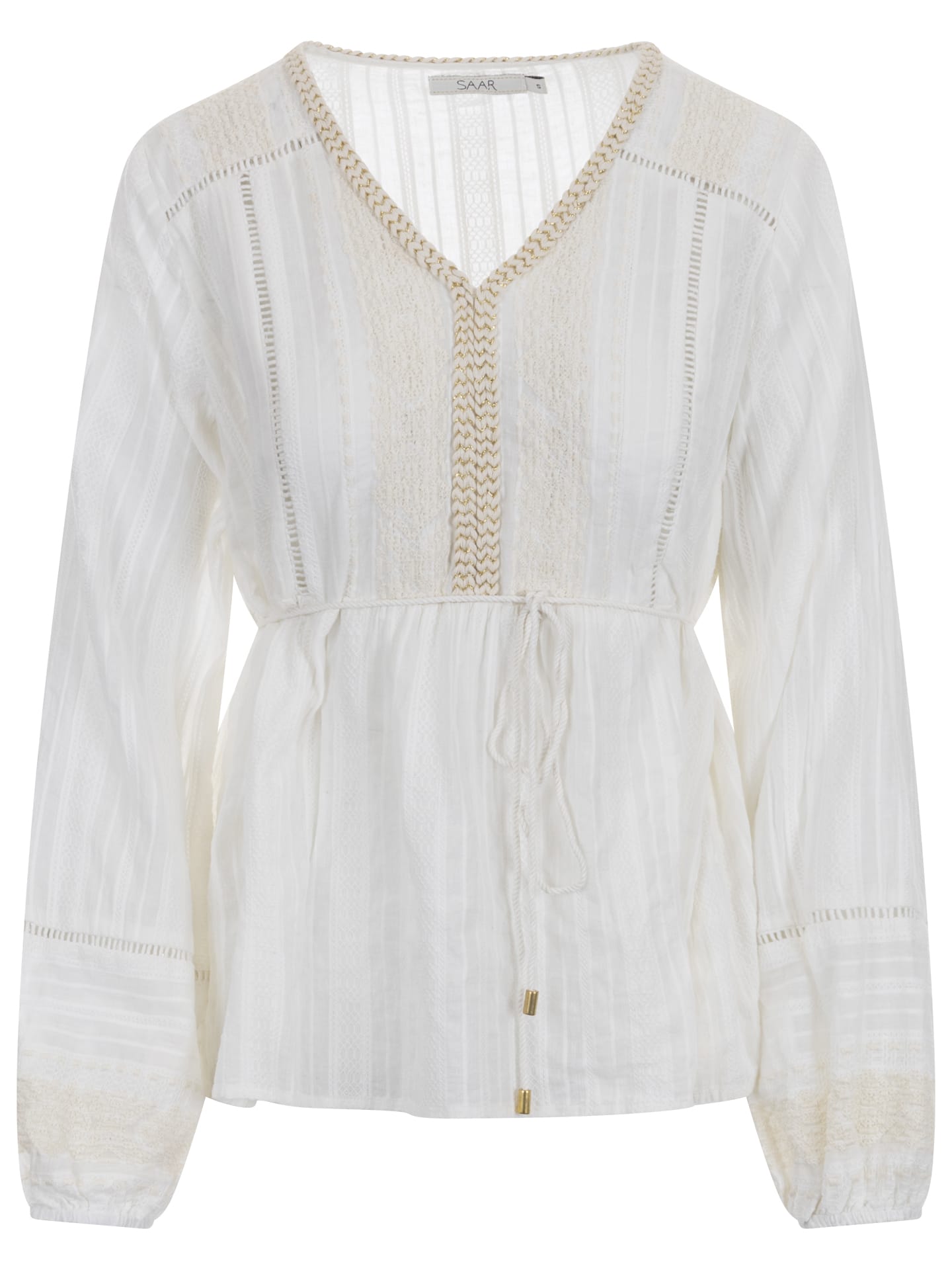Blouse van Saar met lange mouwen voorzien van elastische manchetten, sierlijke V-hals en strikkoord in de taille. Materiaal: Katoen 100%