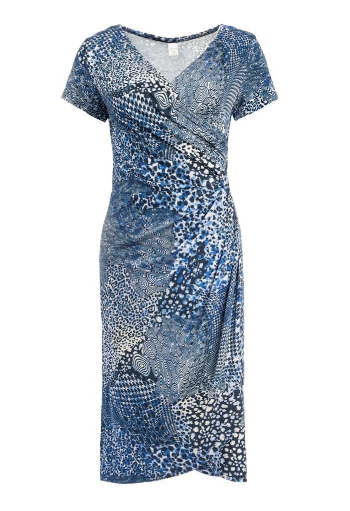 Wikkeljurk van N.E.D. in een all-over dessin met korte mouwen en een V-hals voorzien van overslag. Materiaal: Viscose 96%| elastan 4%