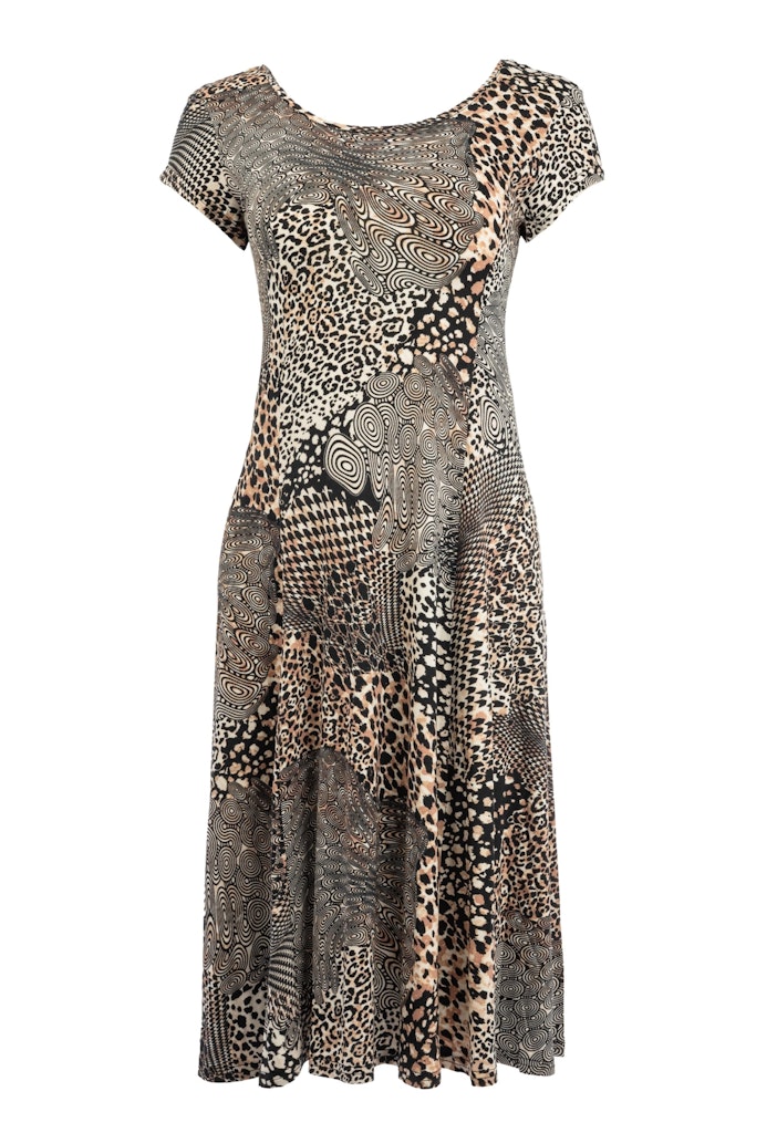 Getailleerde tricot jurk van N.E.D. in een all-over dessin met korte mouwen en een ronde hals. Materiaal: Viscose 96%| elastan 4%