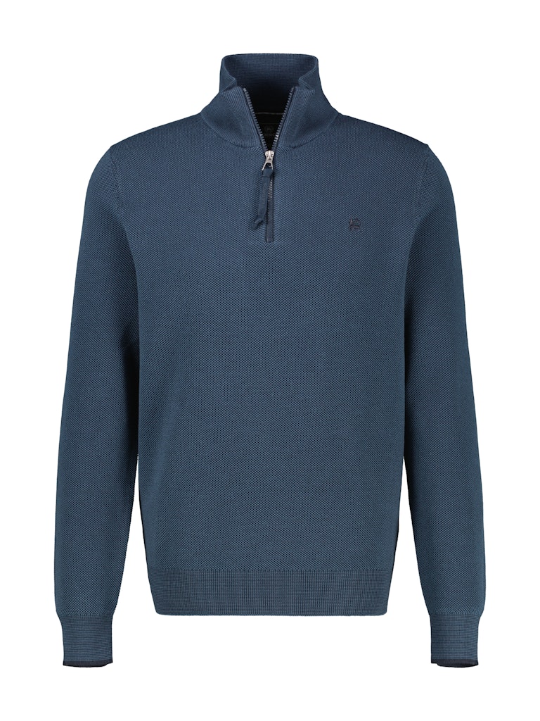 Trui van Lerros met lange mouwen, opstaande kraag voorzien van korte ritssluiting, geborduurd logo op de linkerborst en ribgebreide boorden. Materiaal: Katoen 10%