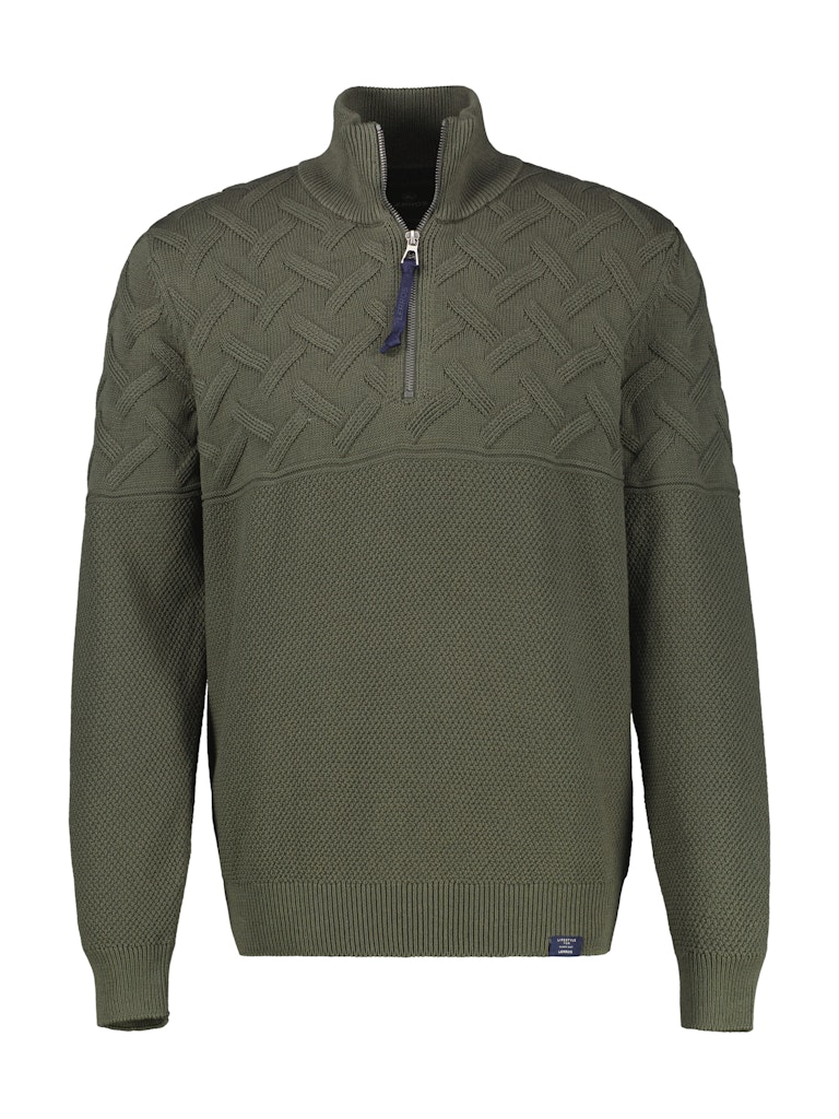 Trui van Lerros in een structuur dessin met een kabelpatroon aan de bovenzijde, lange mouwen, opstaande kraag voorzien van korte ritssluiting en ribgebreide boorden.