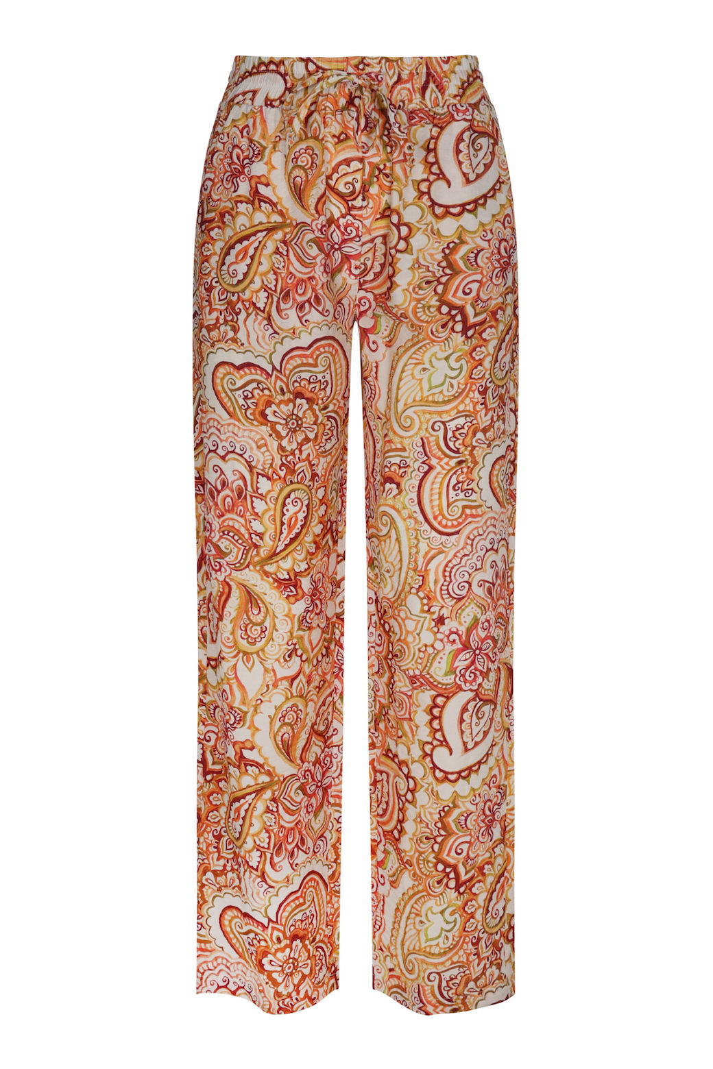 Broek van Elvira in een all-over dessin met wijde pijpen en een elastische tailleband voorzien van trekkoord. Materiaal: Viscose 83%| polyamide 17%