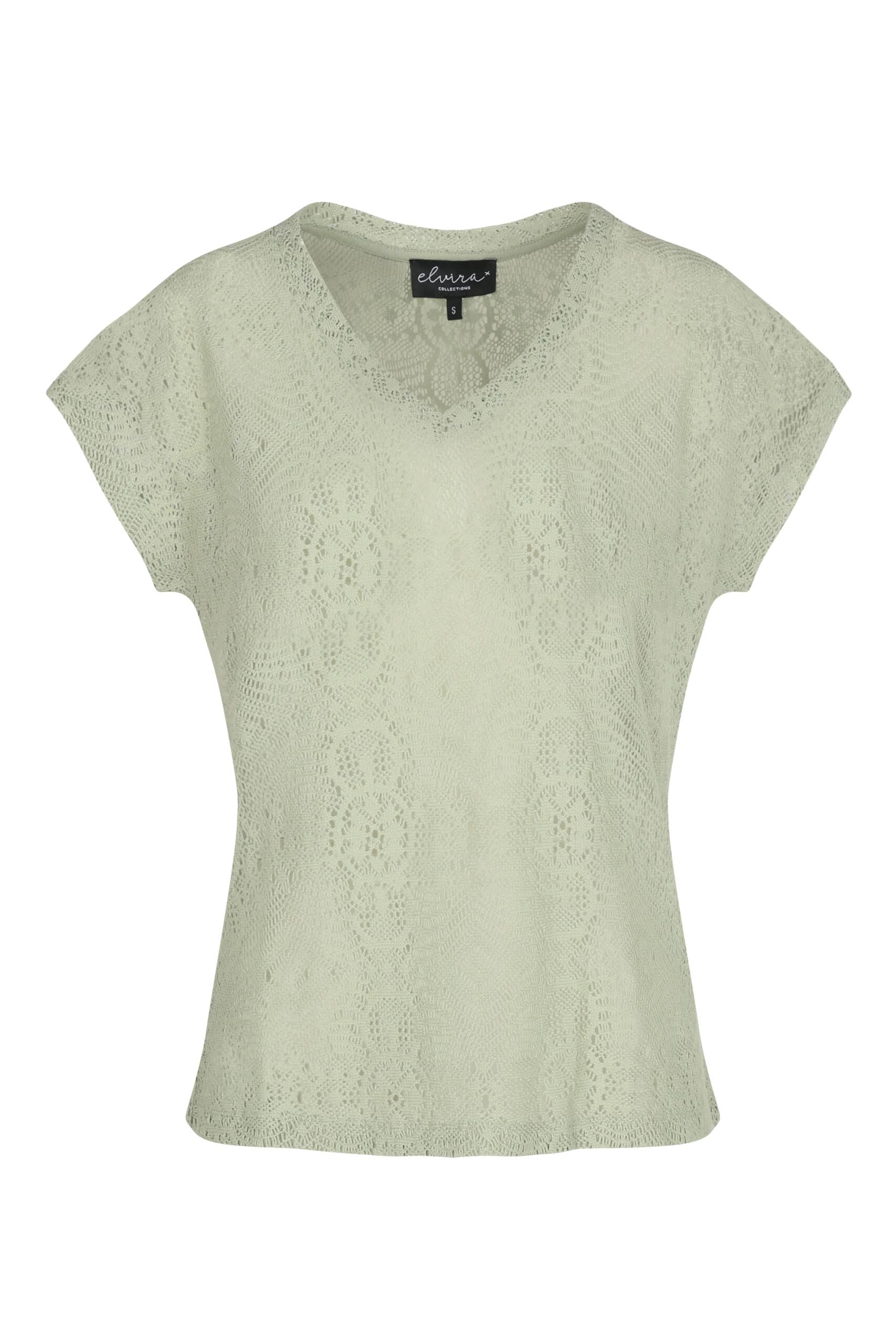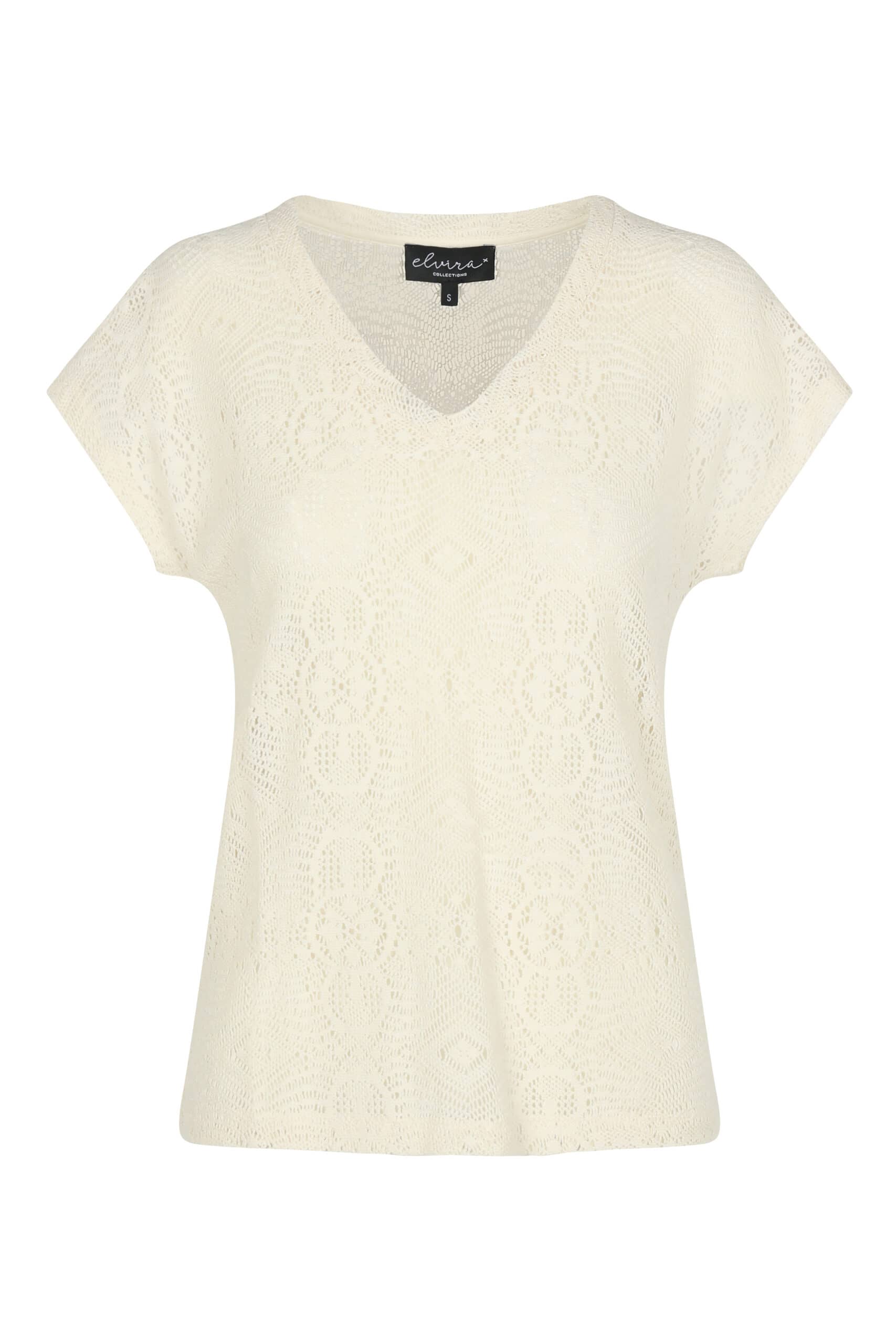 Kanten top van Elvira met korte mouwen en V-hals. Materiaal: Katoen 72%| polyamide 28%