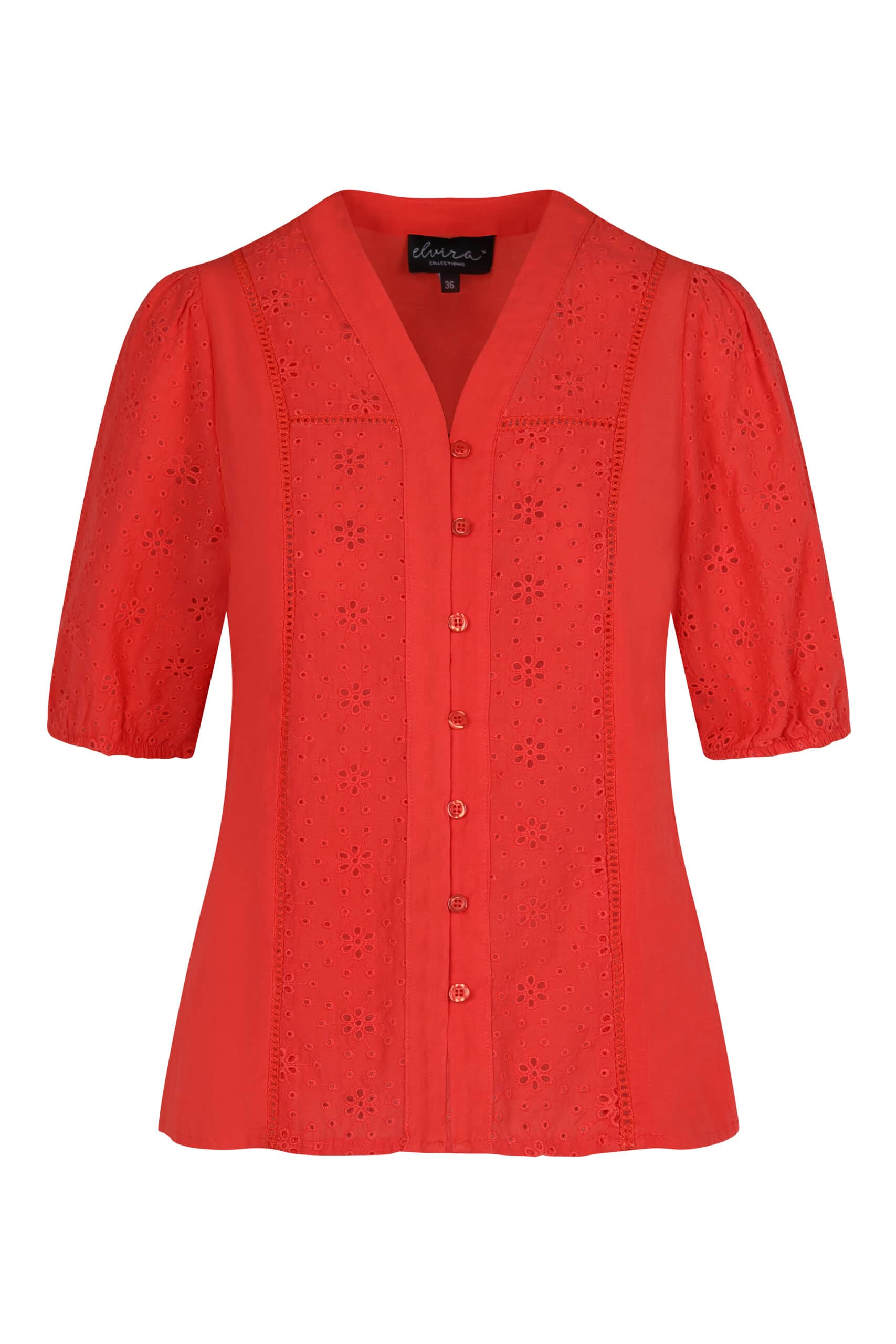 Broderie blouse van Elvira met korte pofmouwen, V-hals en een knoopsluiting. Materiaal: Katoen 100%