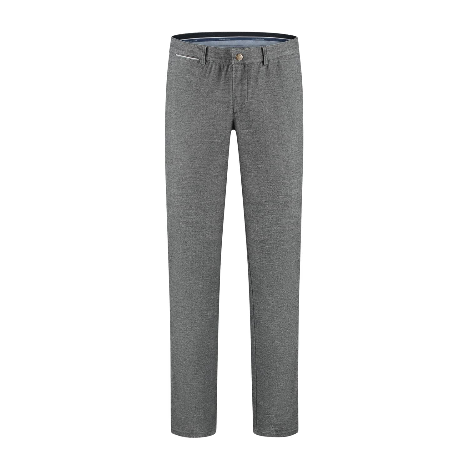 Chino van Com4 in een gemêleerd dessin met een knoop- en ritssluiting, steekzakken, muntzakje en twee paspelzakken aan de achterzijde.