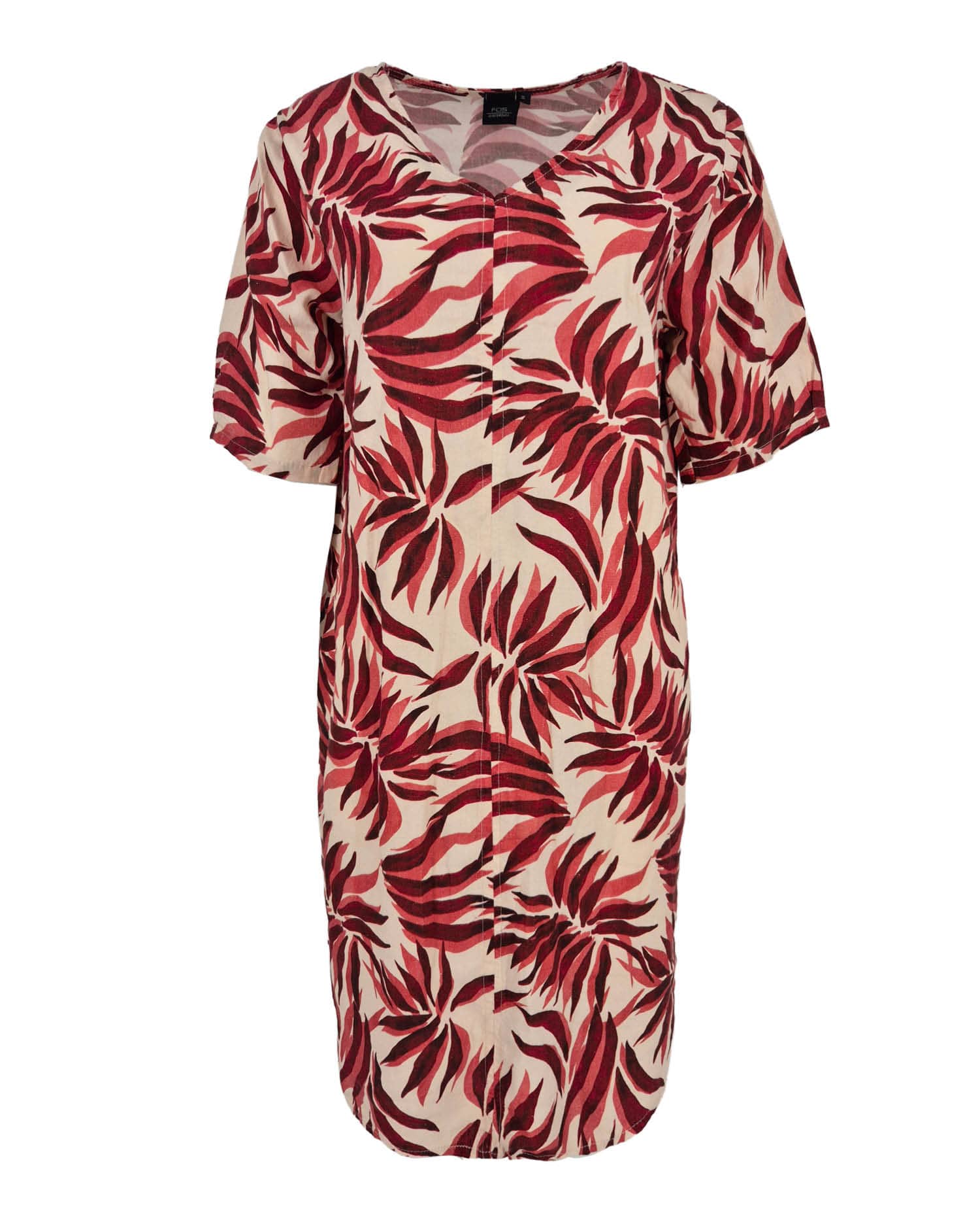 Jurk van Fos Amsterdam in een all-over dessin met korte mouwen, V-hals en steekzakken. Materiaal: Linnen 65%| viscose 35%
