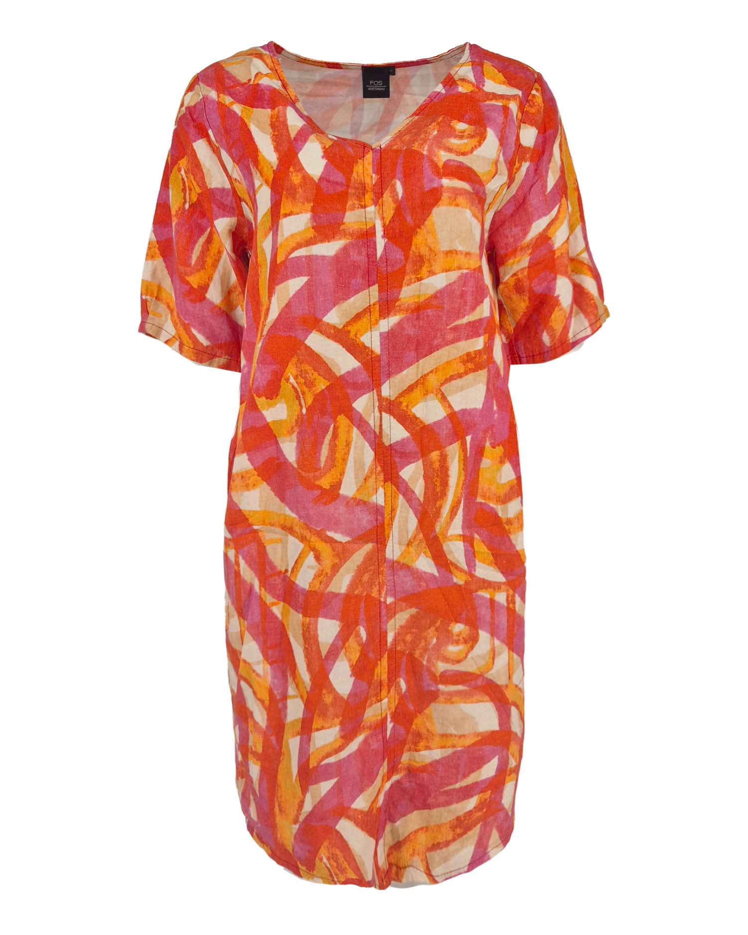 Jurk van Fos Amsterdam in een all-over dessin met korte mouwen, V-hals en steekzakken. Materiaal: Linnen 65%| viscose 35%