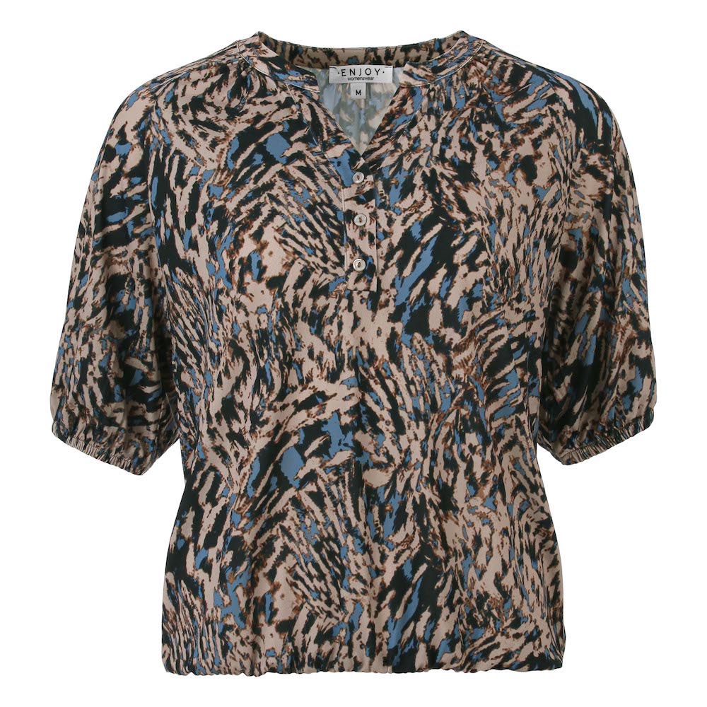 Blouson van Enjoy in een all-over dessin met korte pofmouwen, V-hals voorzien van korte koopsluiting en een elastische zoom. Materiaal: Polyester 92%\ elastan 8%
