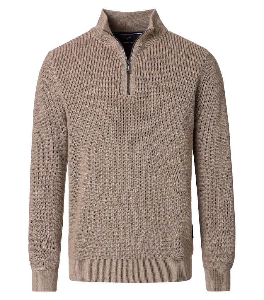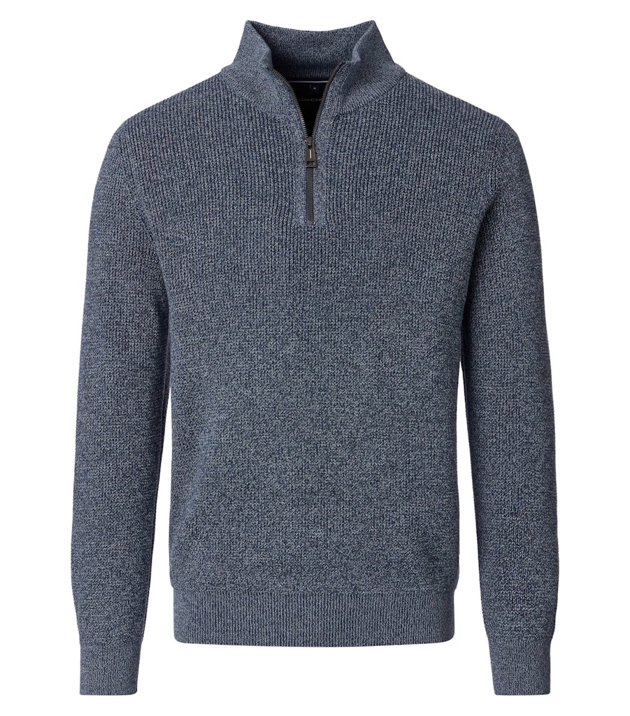 Trui van Casa Moda in een ribstructuur met lange mouwen, opstaande kraag voorzien van korte ritssluiting en ribgebreide boorden. Materiaal: Katoen 60%| acryl 40%
