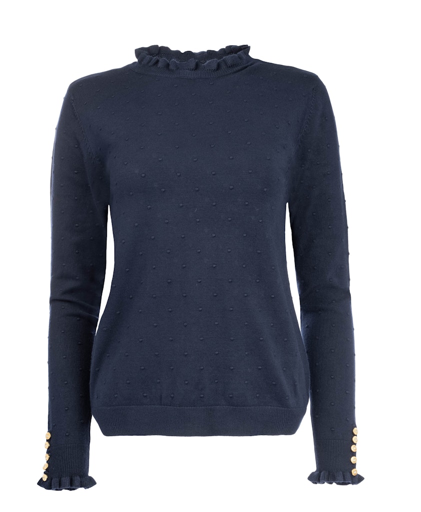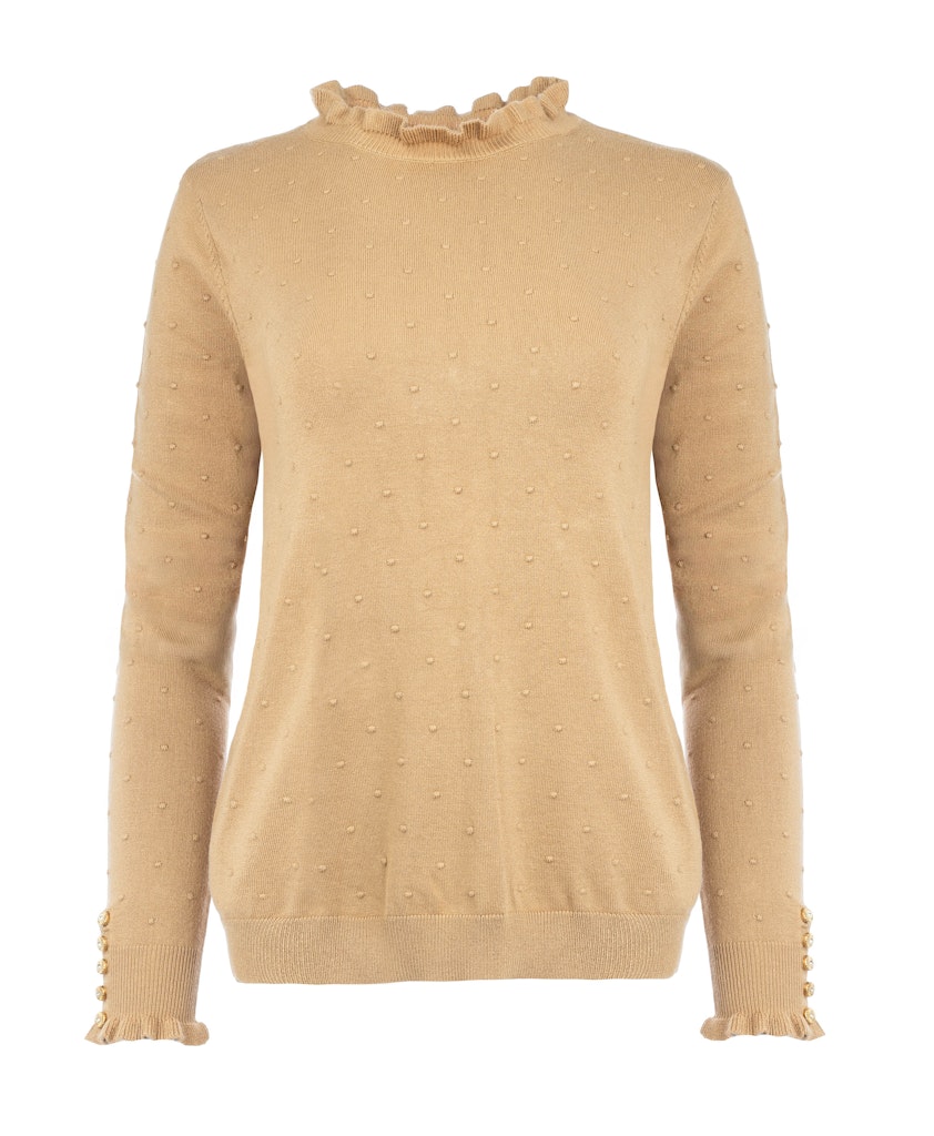 Fijn gebreide trui van N.E.D. in een noppen structuur met lange mouwen voorzien van ruche en knopen, opstaande ruche kraag en ribgebreide boorden.