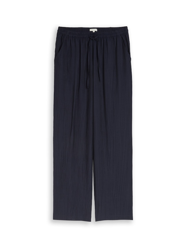 Broek van Tom Tailor in een structuur dessin met wijde pijpen, steekzakken, twee paspelzakken aan de achterzijde en een elastische tailleband voorzien van trekkoord.