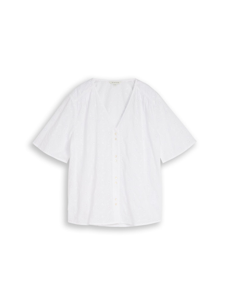 Broderie blouse van Tom Tailor met korte wijde mouwen, V-hals en een knoopsluiting. Materiaal: Katoen 100%