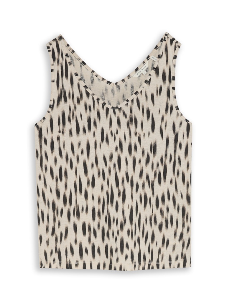 Mouwloze top van Tom Tailor in een all-over dessin met een V-hals aan de voor- en achterzijde. Materiaal: Linnen 52%| polyester 48%