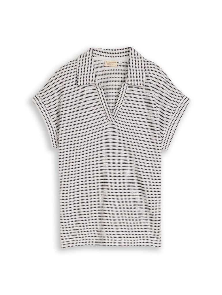 Loose fit jacquard shirt van Tom Tailor in een streep motief met korte aangeknipte mouwen, polokraag en een V-hals. Materiaal: Katoen 100%